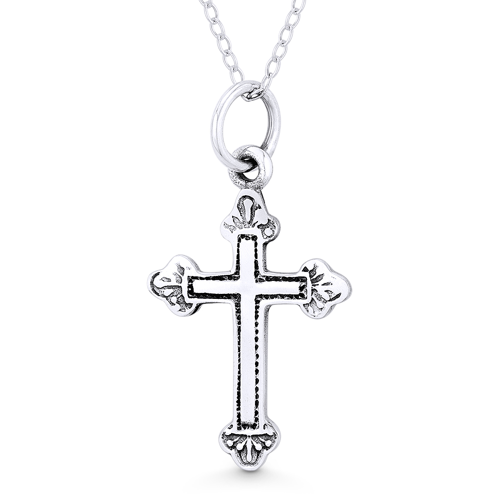 The featured pendant is cast in oxidized-finish .925 sterling silver and showcases a budded cathedral cross finished with a sturdy ring bail that can accommodate most chain sizes.