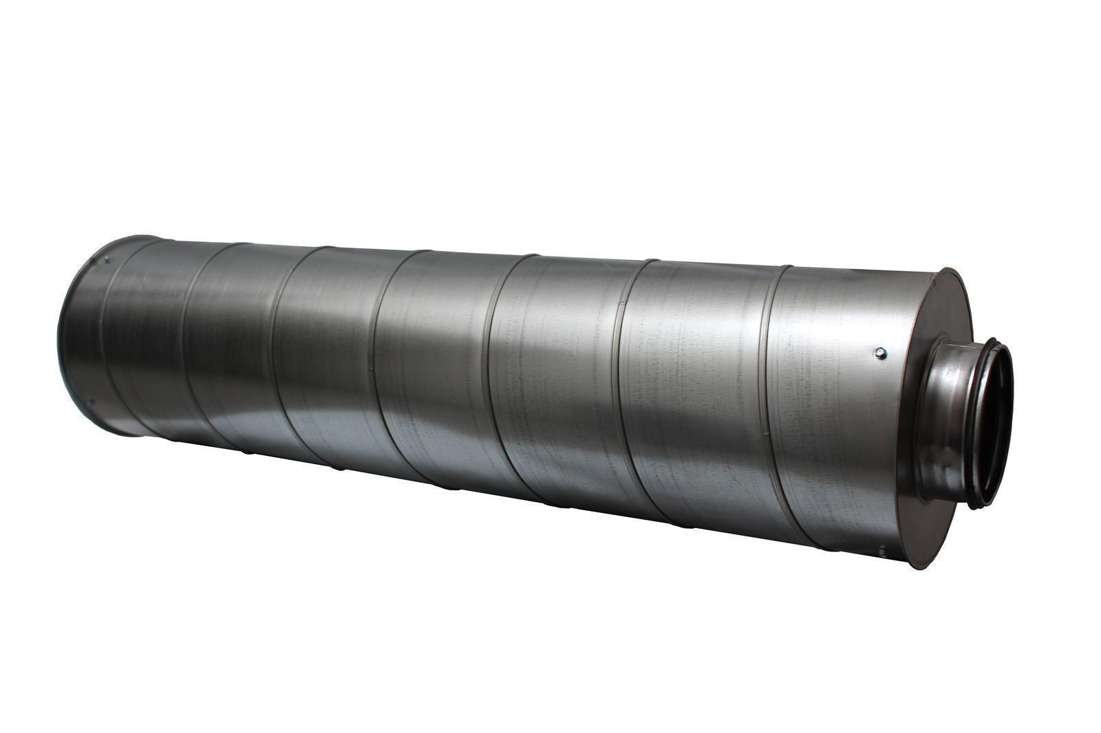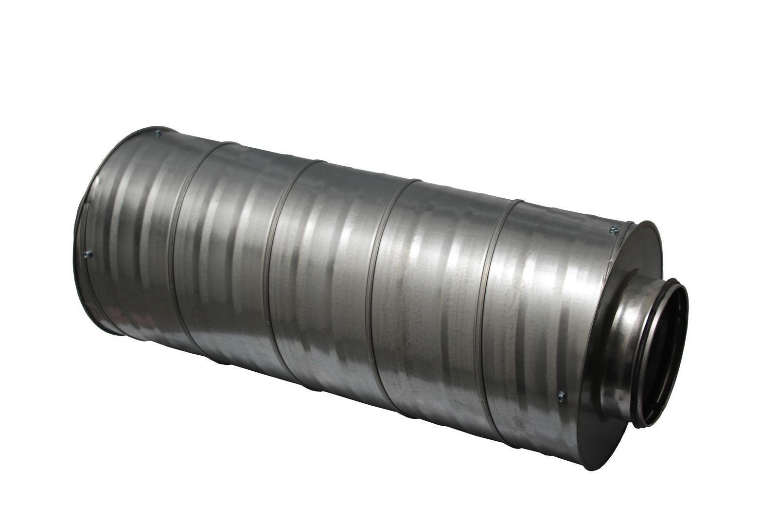 Rohrschalldämpfer aus verzinktem Stahlblech zur Geräuschreduzierung in runden Luftleitungen.
