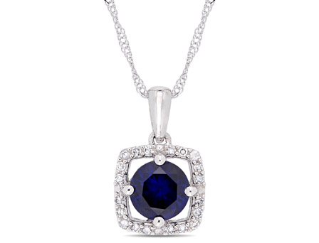 Designed to complement a variety of looks, this Amour Collection Created Blue Sapphire and Diamond Halo Pendant is an elegant addition to any jewelry collection. Crafted in lustrous white gold and enhanced with a high-polish finish, this stunning pendant is suspended on a 17-inch rope chain and comfortably secures with a spring ring clasp. This eye-catching pendant features a round-cut, prong-set created blue sapphire gemstone (6 x 6mm) at the center with a square halo of 20 round-cut, prong-set sparkling diamonds (G-H, I2-I3). This gemstone and diamond pendant is an ideal September birthstone gift.