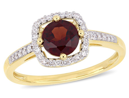 Be prepared to dazzle in this enchanting Amour Collection Diamond & Garnet Halo Ring. Crafted in shimmering yellow gold, this ring features a round-cut, prong-set garnet gemstone (6 x 6mm) at the center, surrounded by 34 round-cut, pave-set diamonds (G-H, I2-I3) forming a square halo and adorning the sides of its band, giving it a designer look. Enhanced with a high-polish finish, this gemstone and diamond ring this will become an instant classic for any wardrobe.