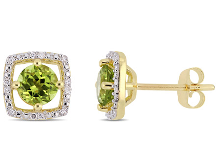 These striking Amour Collection Peridot and Diamond-Accent Halo Earrings are crafted in glistening yellow gold. They feature two round-cut, prong-set peridot (5 x 5mm) gemstones along with 24 round-cut, prong-set twinkling diamonds (G-H, I2-I3) forming square halos. These gemstone and diamond-accent stud earrings are enhanced with a high-polish finish and secure with butterfly closures.