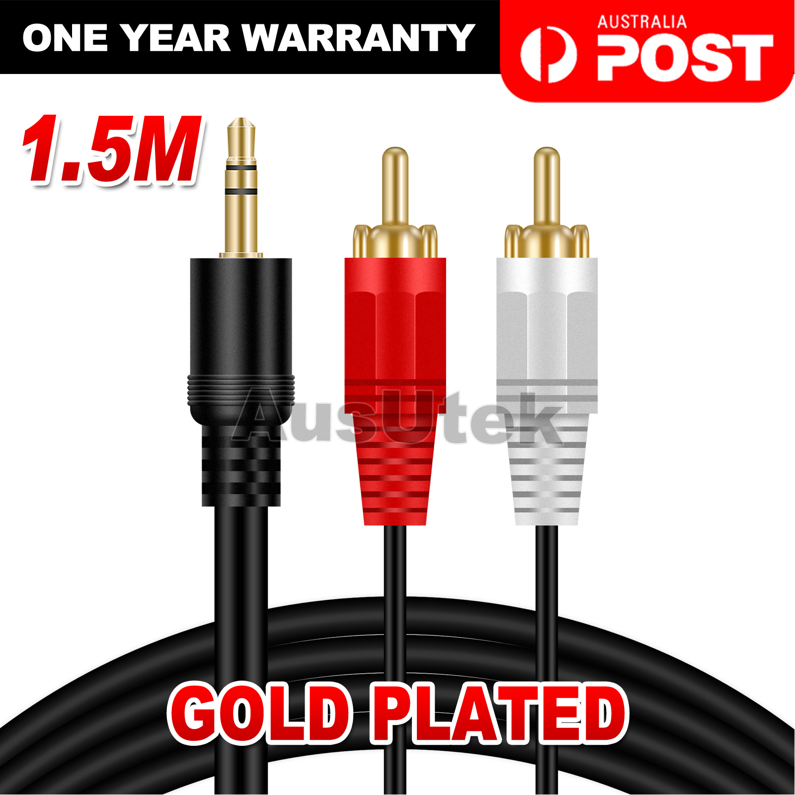 - Connectors: One End with a 3.5mm Stereo Plug and 2 RCAs on the other End.