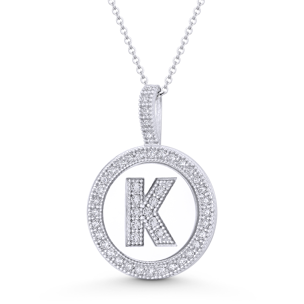 The featured pendant is cast in 14k white gold and showcases a 13mm round disc adorned with round cut cubic zirconia crystals arranged to form an initial "K" design. The disc is then paved with cz crystal accents all the way around the circle outline & bail and can come optional with a thin cable chain necklace.