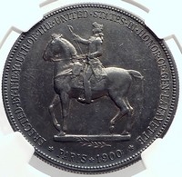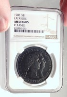 United States of America - Lafayette Dollar Erection of Lafayette Monument - Commemorative issue 1900 Silver Dollar 38.1mm (26.73 grams) 0.900 Silver Reference: KM# 118 | Mintage: 36,026 Certification: NGC Ancients AU DETAILS 4703363-003 * UNITED · STATES · OF · AMERICA * LAFAYETTE · DOLLAR, Jugate heads of George Washington and marquis de Lafayette. * ERECTED · BY · THE · YOUTH · OF · THE · UNITED · STATES · IN · HONOR · OF · GEN · LAFAYETTE *PARIS * 1900, Statue of Lafaytette on horseback galloping left drawing sword from sheath. This was the first commemorative coin with the dollar denomination and the first authorized United States coin to feature a portrait of a U.S. president. The dies of the coin were designed by the famous Charles E. Barber. Thes statue was a gift of the American people of General Lafayette erected in Paris. These coins were originally sold by the Lafayette memorial commission to help raise money for $2. You are bidding on the exact item pictured, provided with a Certificate of Authenticity and Lifetime Guarantee of Authenticity.