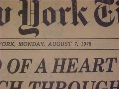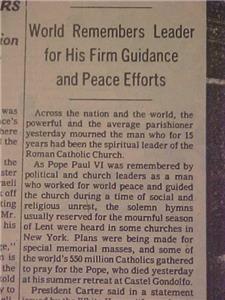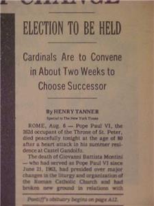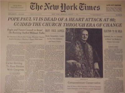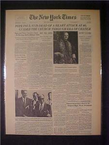 I Offer This Very Displayable Mini-Newspaper Headline - The New York Times - For August 7, 1978 - Pope Paul VI Is Dead Of A Heart Attack At 80; Guided The Church Through Era Of Change; Election To Be Held; Cardinals Are To Convene In About Two Weeks To Choose Successor.