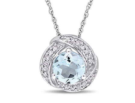 An enchanting symbol of your everlasting love, this gorgeous Amour Collection Sky Blue Topaz and Diamond Trilliant Halo Pendant will lend an eye-catching touch of sparkle to your look. Crafted in white gold, this pendant features a round-cut, prong-set sky blue topaz (6 x 6mm) gemstone at the center surrounded by 21 round-cut, pave-set twinkling diamonds (G-H, I2-I3) to give it a unique look. Suspended on an 17-inch chain, this lovely pendant secures with a spring ring clasp and is elegantly and stylishly crafted for many evenings of fine dining. This gemstone and diamond pendant is enhanced with a high-polish finish and looks breathtaking.