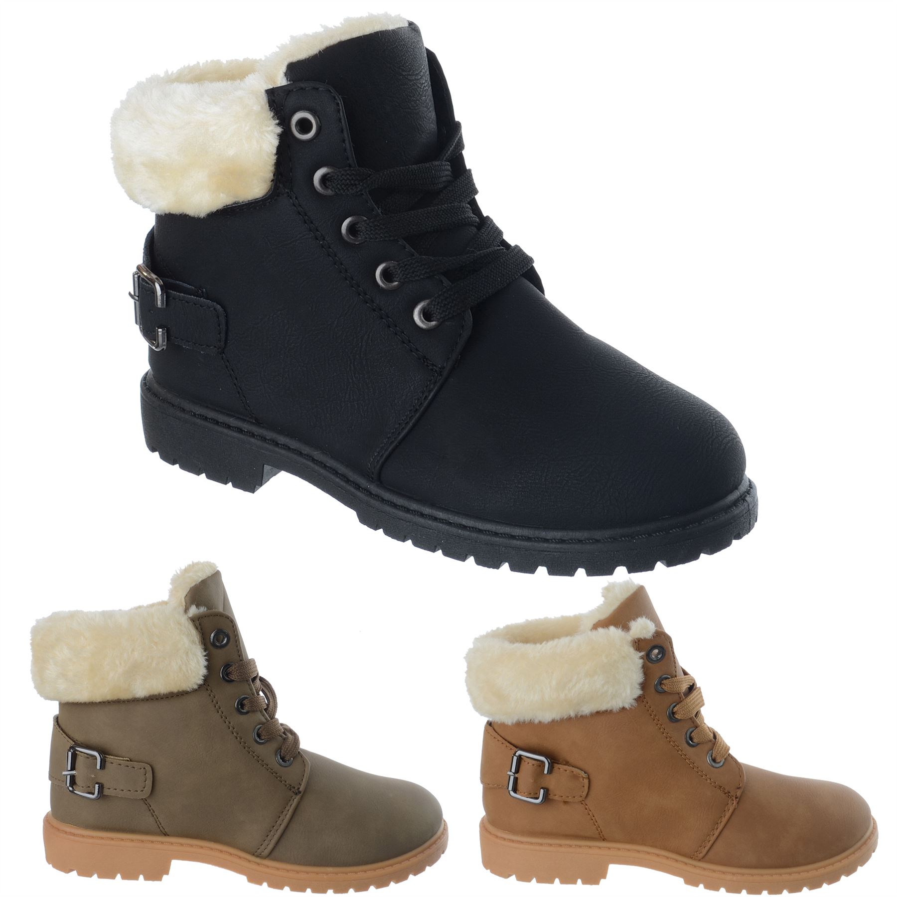 Childrens Girls Kids Lace Up Faux Fur Lined Warm Combat Ankle Boots Shoes Size