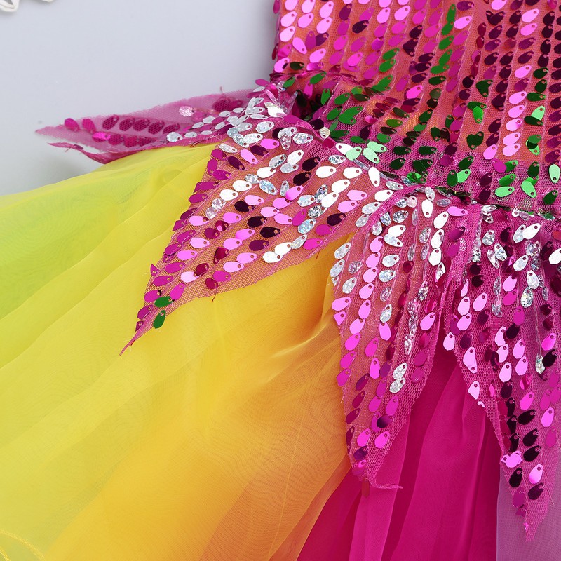 Wasit attached with leaf shape sequined mesh overlay. 2 layers dress, top colorful tulle layer, 1 layer satin lining. Matching wristband with irremovable flower.