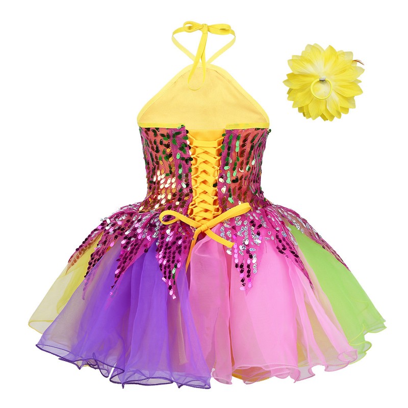 Matching a hair clip with irremovable flower, 2 layers elastic waistband tutu dress, top tiered tulle layer, 1 lining. Beautiful dance costume for your girl.