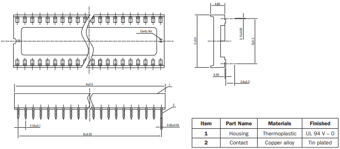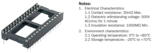 High quality 40-pin dual-in-line narrow 15.24mm sockets with black thermoplastic body and tin-plated copper alloy contacts. Sockets have chamfered side walls to assist insertion. One end is indented for easy identification of the polarisation.