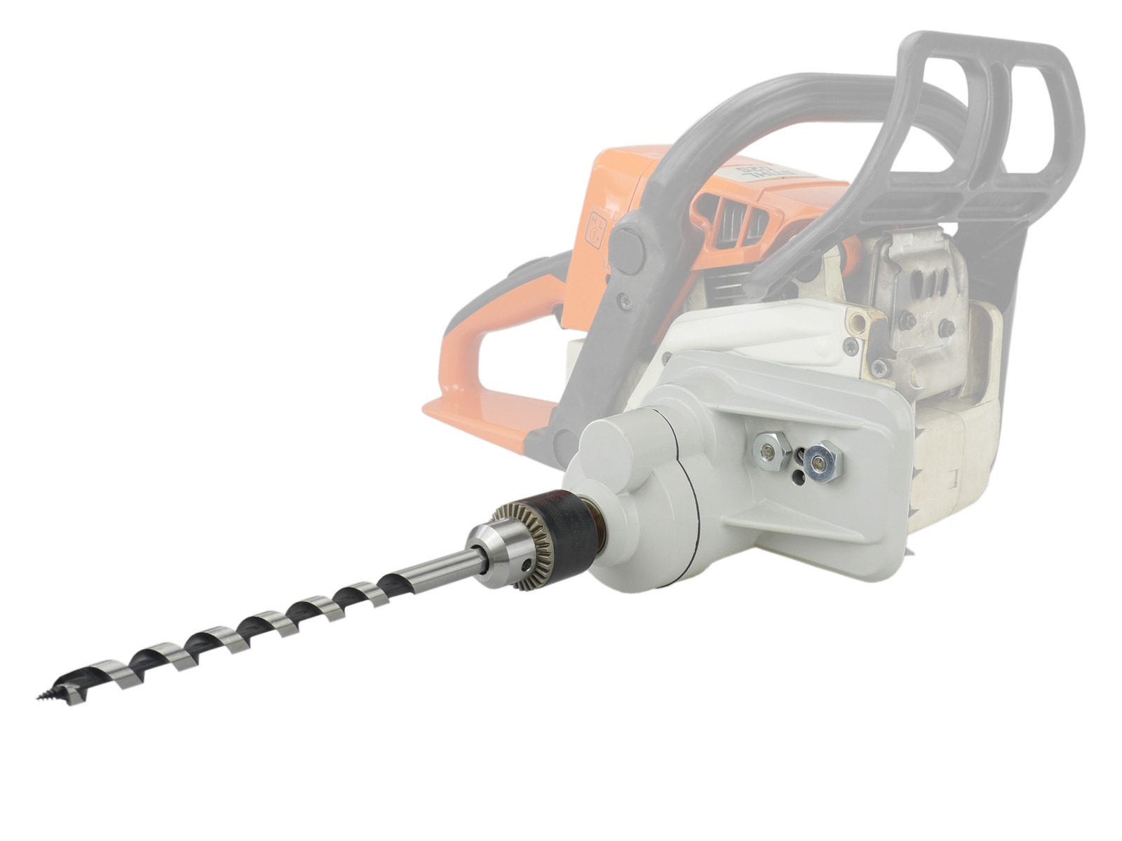 Bohrmaschinenaufsatz Anbaugerät für Stihl Motorsäge 017 / 018 / MS 170 / MS 180 / 021 / 023 / 025 / MS 210 / MS 230 / MS 250 für 3/8" 6 Zahn Kettenrad inkl. Holzbohrer