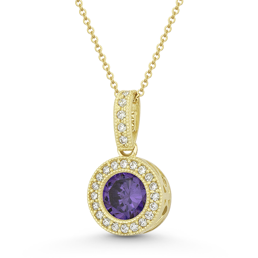 The featured pendant is cast in 14k yellow gold and showcases a 9mm halo design adorned w/ a 6mm round brilliant cut purple cubic zirconia surrounded by round cut clear cz crystal accents. The halo is then finished with a sturdy bail set w/ cz crystals and can come optional with a thin cable chain necklace.