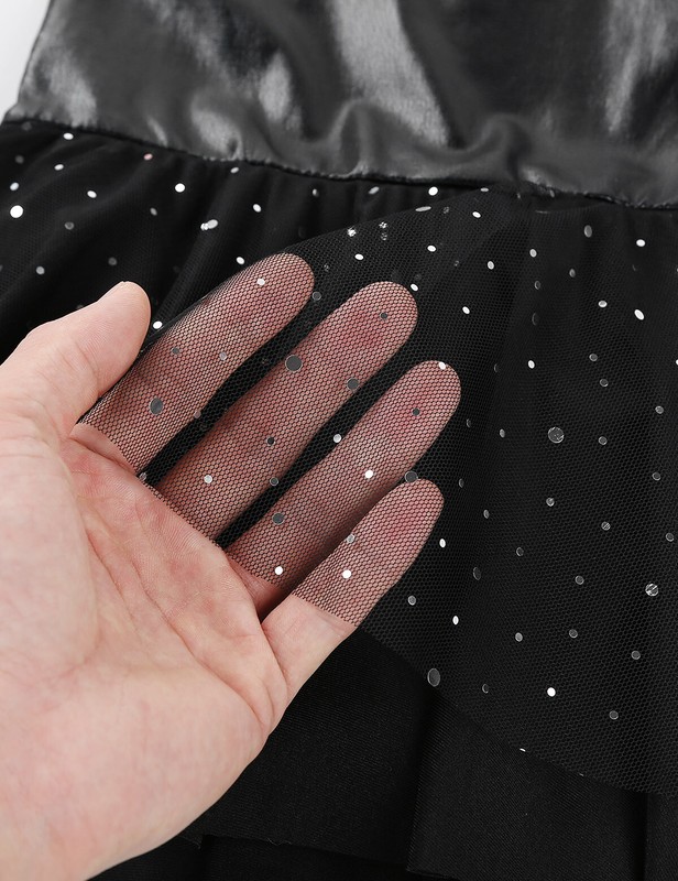 Ballet leotard dress is made of polyester, mesh and sequins material, hand wash.