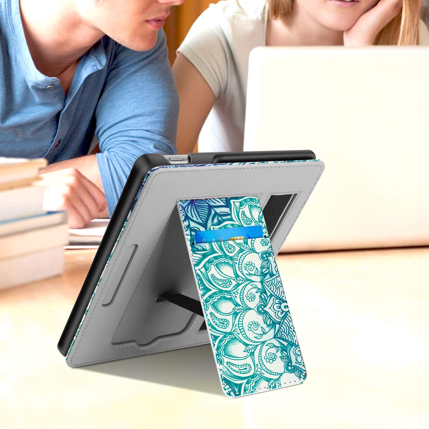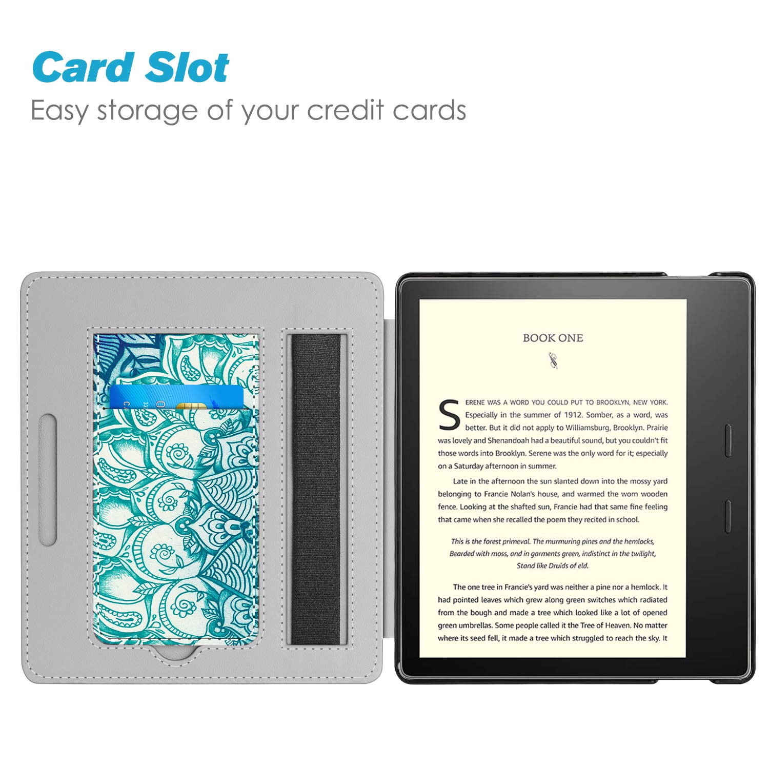 Foldable stand design could set your hands free during your reading. Build-in card slot is convenient to store your cards and cashes.