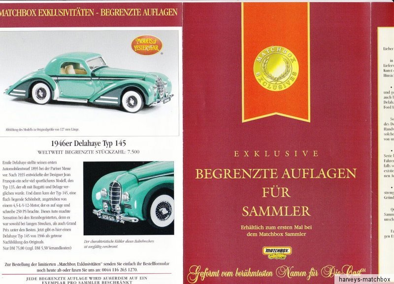 Hier biete ich an: Matchbox Models of Yesteryear / Dinky Serie original Werbepropekte aus der "Collectibles" Zeit Während der "Matchbox Collectibles" Zeit von 1993 bis 2004 als die Matchbox Yesteryear und Dinky Modelle ausschließlich im Direktvertrieb angeboten wurden gab es zu jeder Serie und zu jedem Sondermodell natürlich entsprechende Werbung in Form dieser Prospekte hier. Häufig sind diese Prospekte mehfach gefaltet da sie einfach mit in die Schachteln der Modelle eingelegt wurden. Bei den hier angebotenen Artikeln handelt es sich nur um die Prospekte, KEINE Modelle! Paper prospects only, NO models! 6. "Exclusiv" Serie 1998 Faltblatt für die 6. "Exclusiv" Serie 1998.