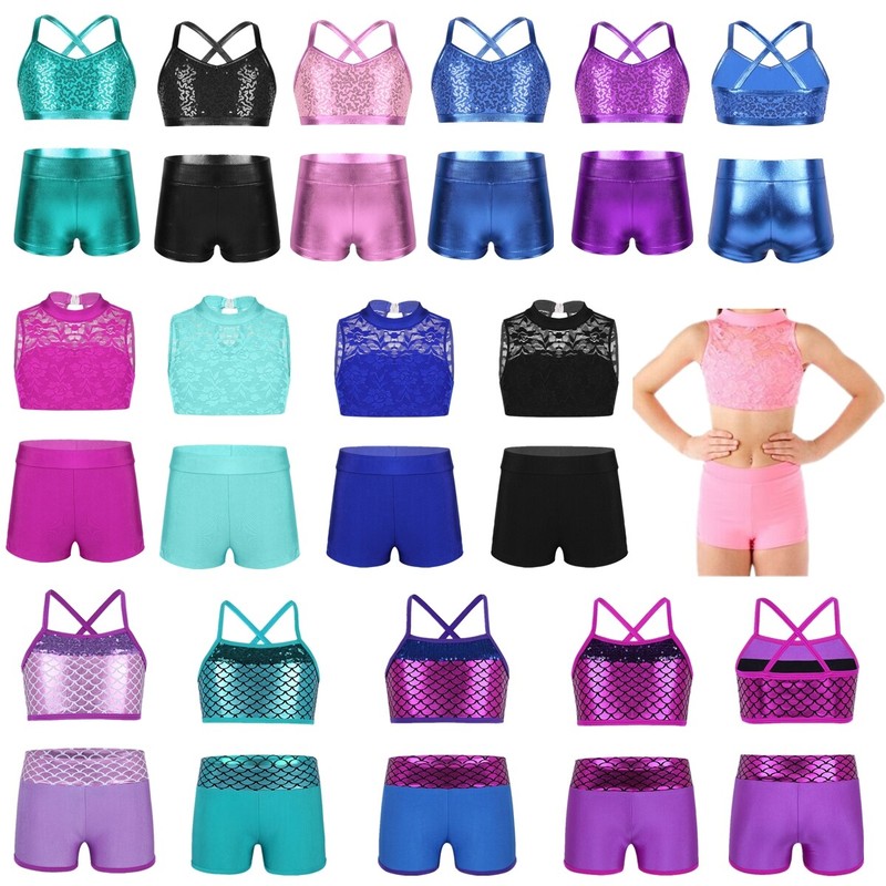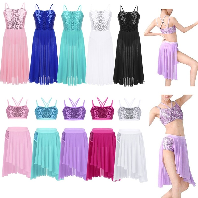 Elastic waistband bottoms covered with side split asymmetrical tulle. Beautiful dance costume set for your girl.