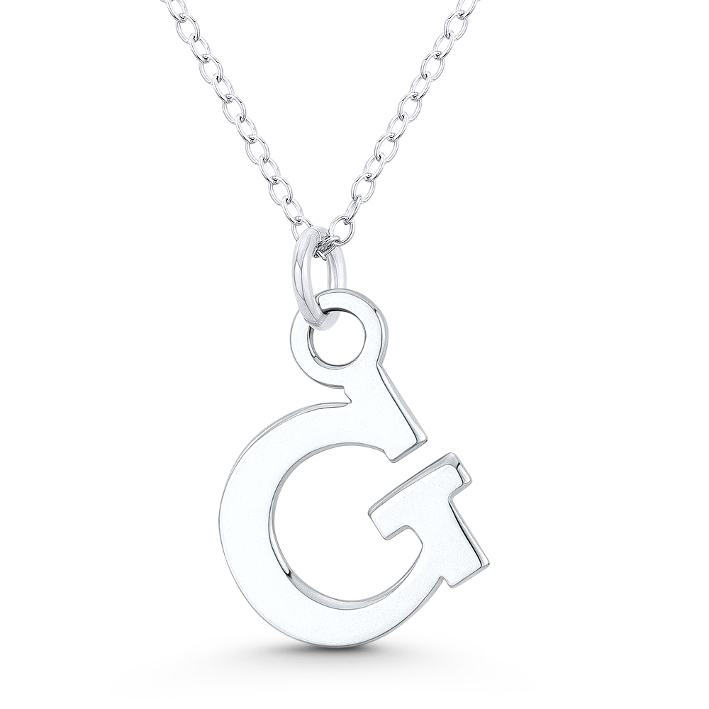 The featured pendant is cast in .925 sterling silver and showcases a 13x13mm (0.5in x 0.5in) initial "G" design. The pendant is then finished with a small ring bail that can accommodate thin chains so it can be worn as a pendant or as an additional charm for your bracelets, necklaces, or other accessories.