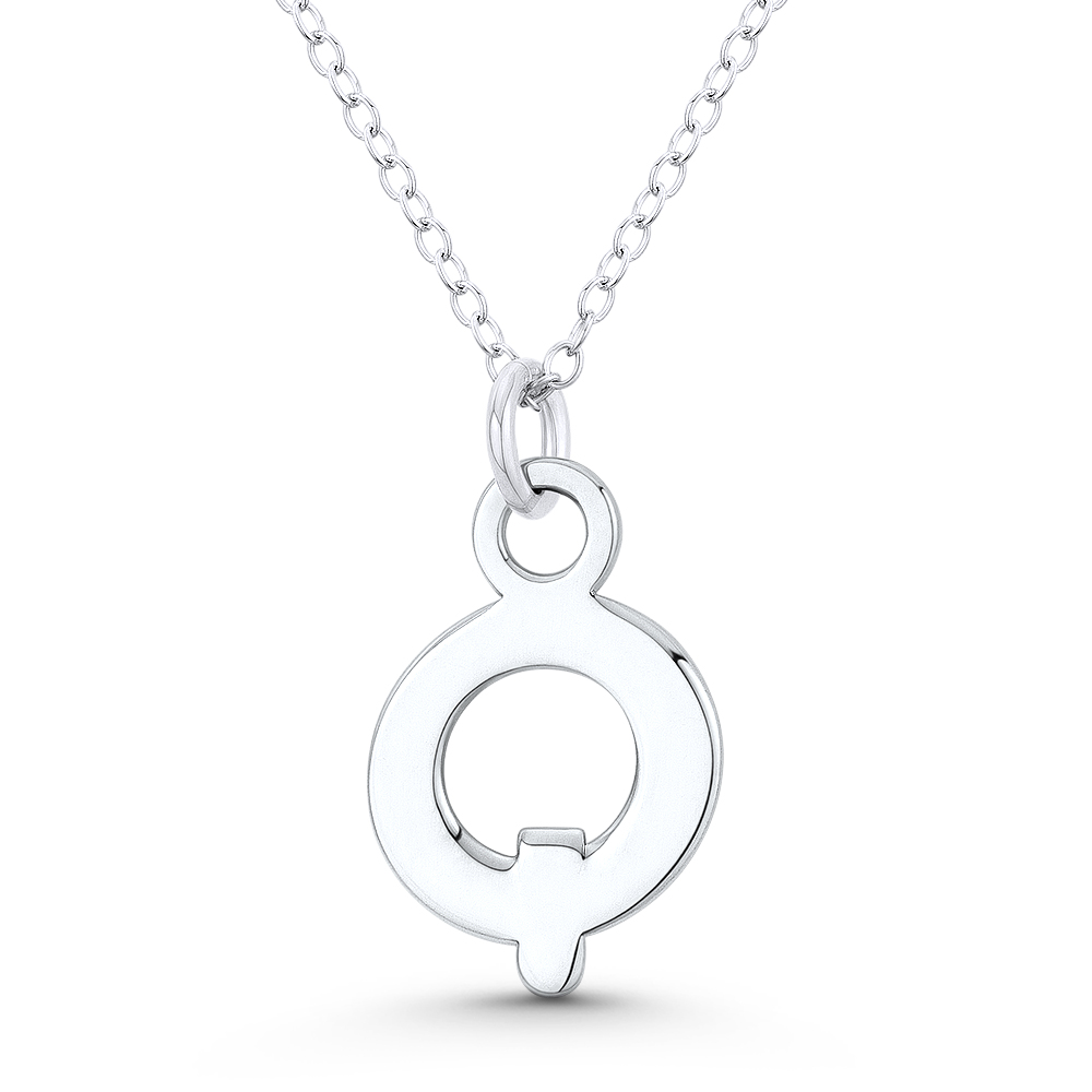 The featured pendant is cast in .925 sterling silver and showcases a 14x12mm (0.6in x 0.5in) initial "Q" design. The pendant is then finished with a small ring bail that can accommodate thin chains so it can be worn as a pendant or as an additional charm for your bracelets, necklaces, or other accessories.