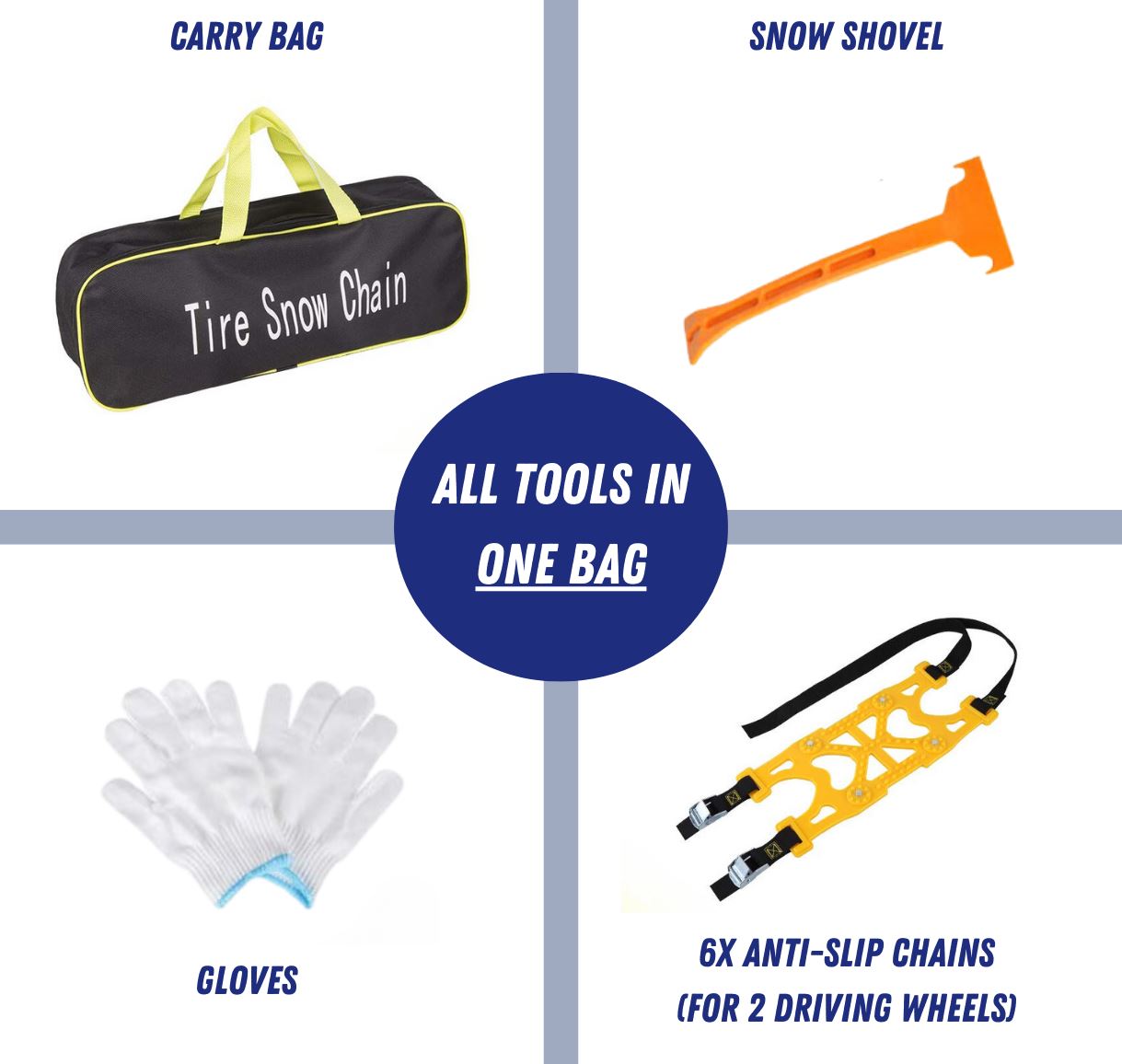 Steel nails adopt preset process, one time molding: Breaking ice under the pressure of the tire, and grasp the ground, steel nails embedded in the chain are not easy to fall off, the density is evenly distributed, the hardness is increased, and each of the tires snow chains has 4 hardened steel nails. FF or FR Uses Set of 6pcs