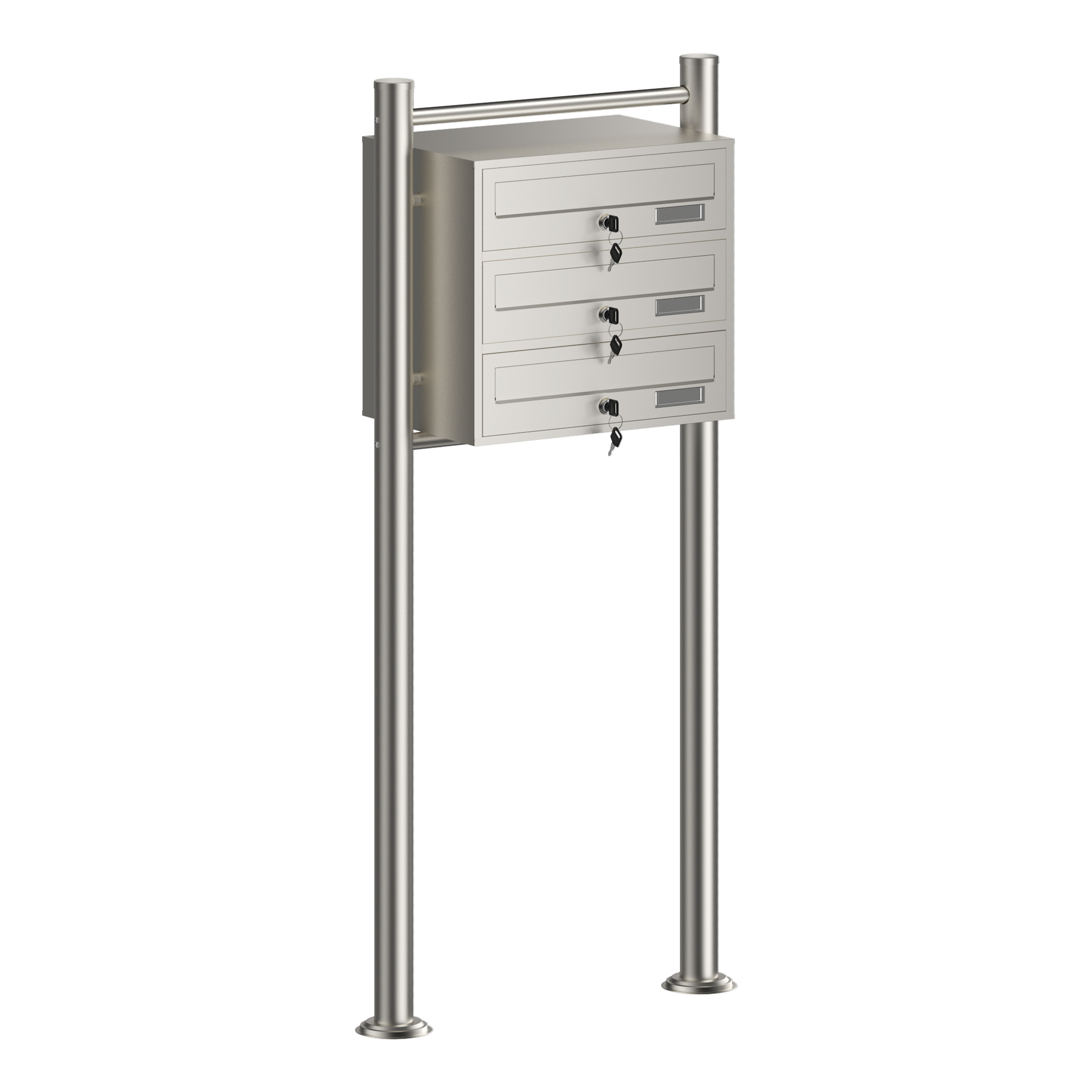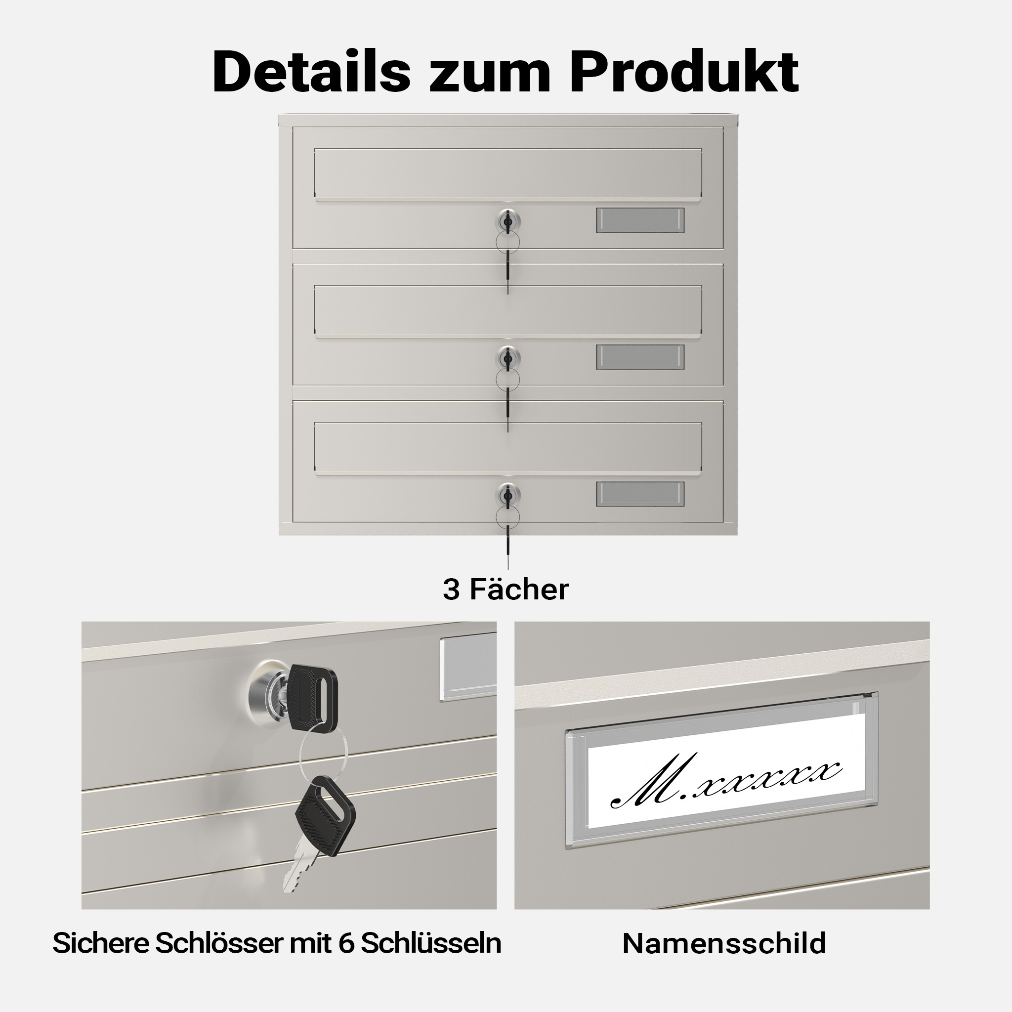 Ciascuno dei 3 scomparti della cassetta postale è dotato di una serratura con 2 chiavi, che garantisce la sicurezza della vostra posta. Le finestre per le targhette con i nomi consentono una chiara identificazione e aggiungono un tocco personale.