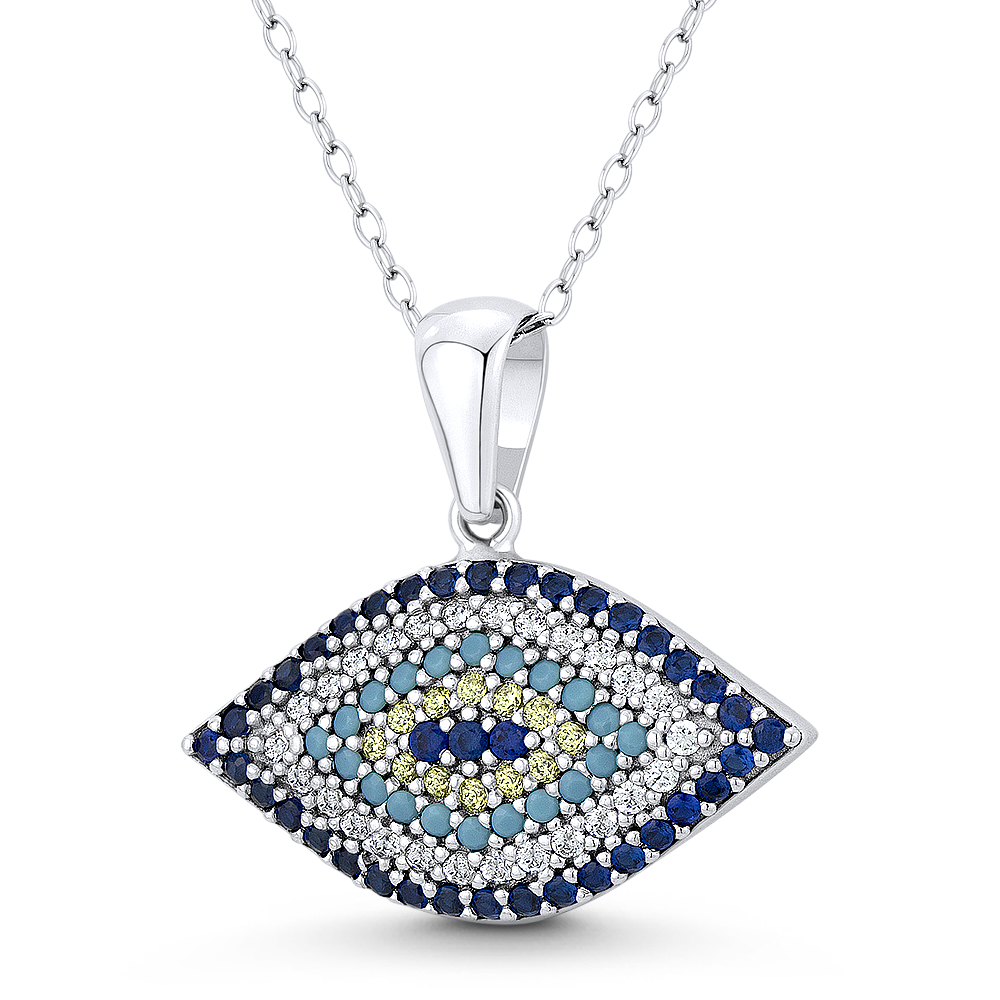 The featured pendant is cast in rhodium-plated .925 sterling silver and showcases a 14mm x 25mm charm paved with nano & cubic zirconia crystals. The eye charm is then finished with a sturdy bail that can accommodate most chain sizes.
