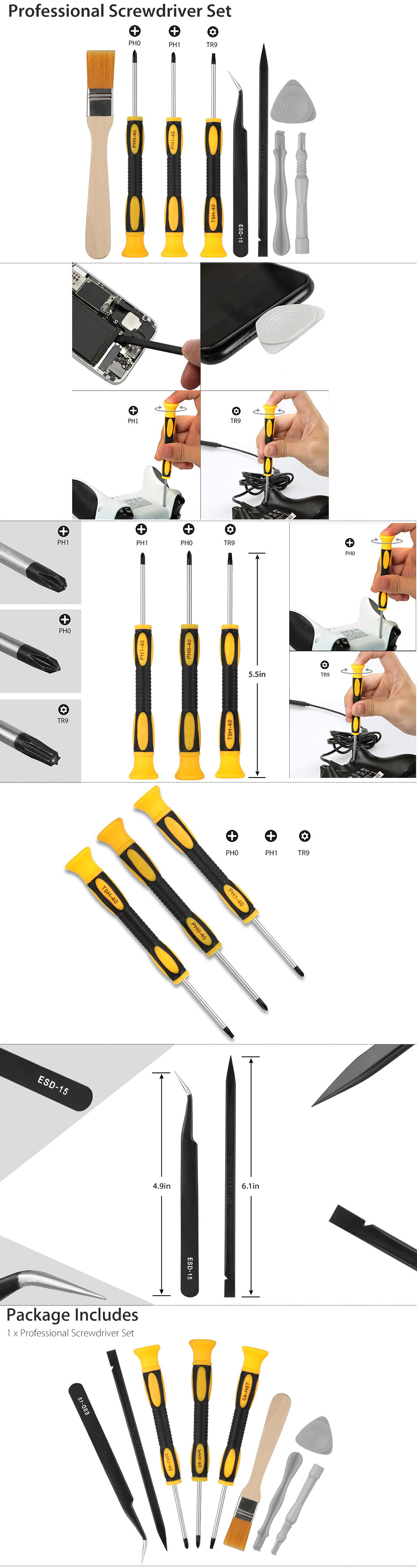 Product Features: Complete Professional Screwdriver Set Repair Tool Kit with Basic Pry Kits for Playstation Consoles and Controller PS4, etc.Screwdriver Bits include: Security Torx Screwdriver T9 (TR9), PH0, PH1.Safe Pry Opening Tool Kits include: Cleaning Brush, Precision ESD Tweezers, Spudger Tool, Opening Picks, Safe Pry Opening Kits.Premium quality Magnetic Screwdrivers precision head driver perfect for handling tiny electronics screws, Bits made of CR-V steel with plastic handle, durable for long time use.Flexible head, non-skid design and professional repair tool. Product Specification: