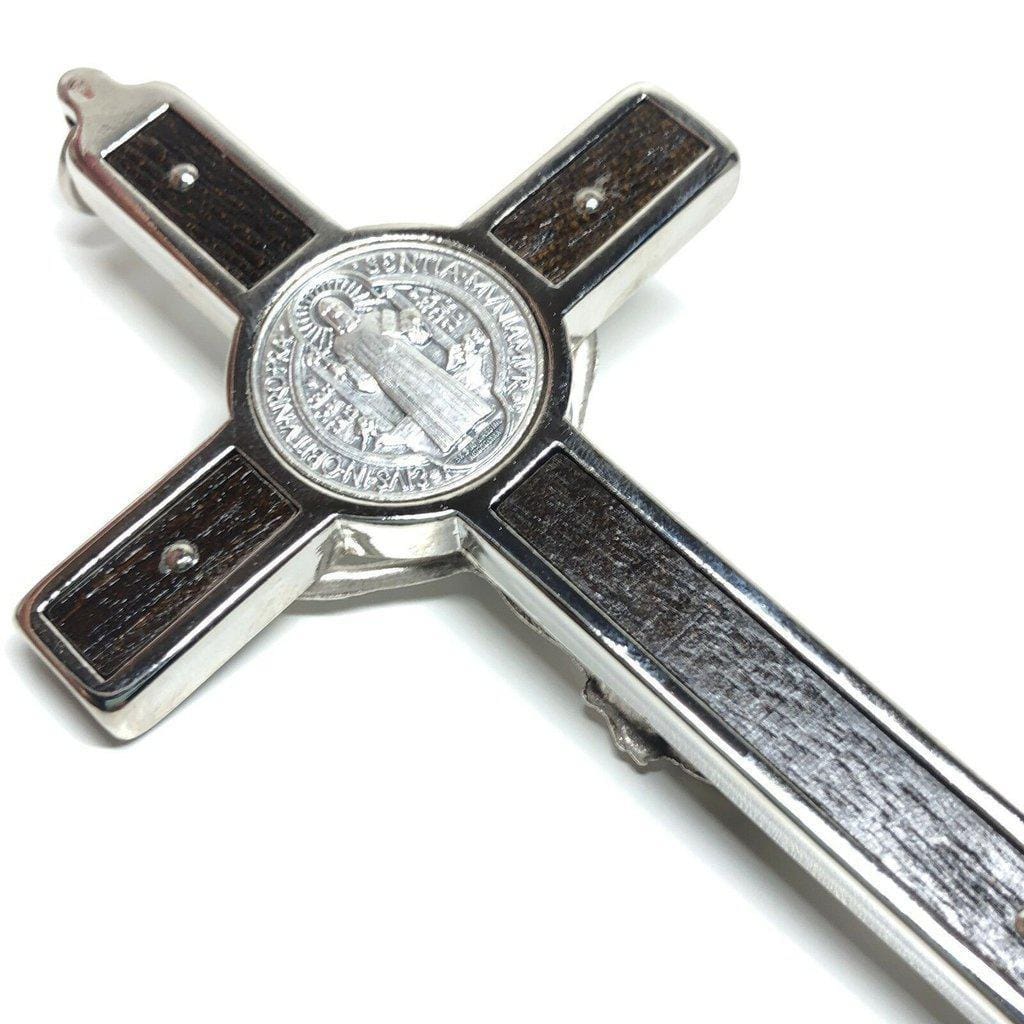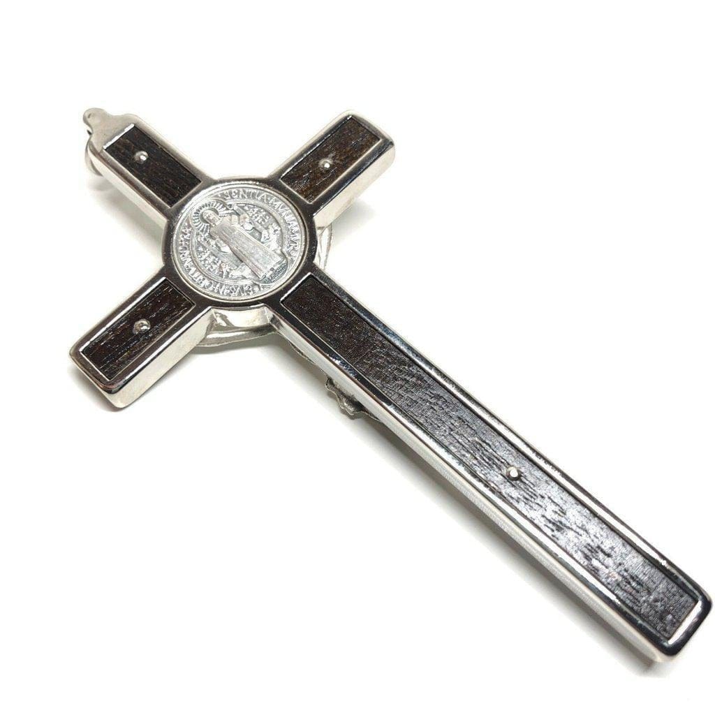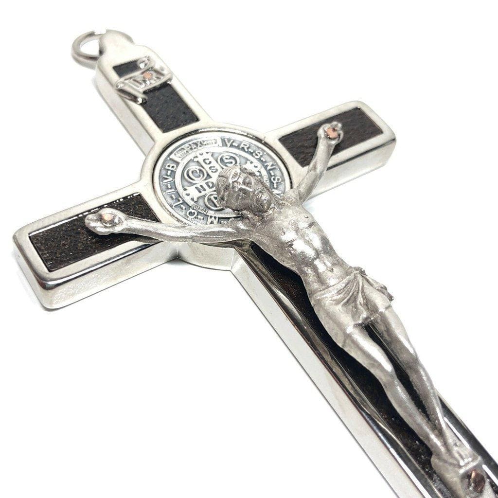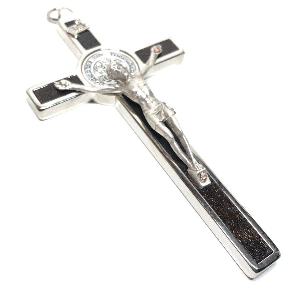 A big St. Benedict crucifix with great detail. The color is WOODEN & silver-color brass metal. Of course there is also the St. Benedict medal in the front and in the back of the crucifix. It's a fantastic cross.