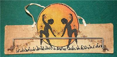 A "cunnin", as we say in Maine, vintage homemade towel rack, with a burlap covered board back, a pair of dancers fashioned in felt, holding an embroidered floral swag as they dance , above a folding chrome bar. There is a white ribbon for hanging. It measures 14 7/8" by 7 1/8". and nicely shows its age, 1930s, I'd guess, with very light soiling and fading.