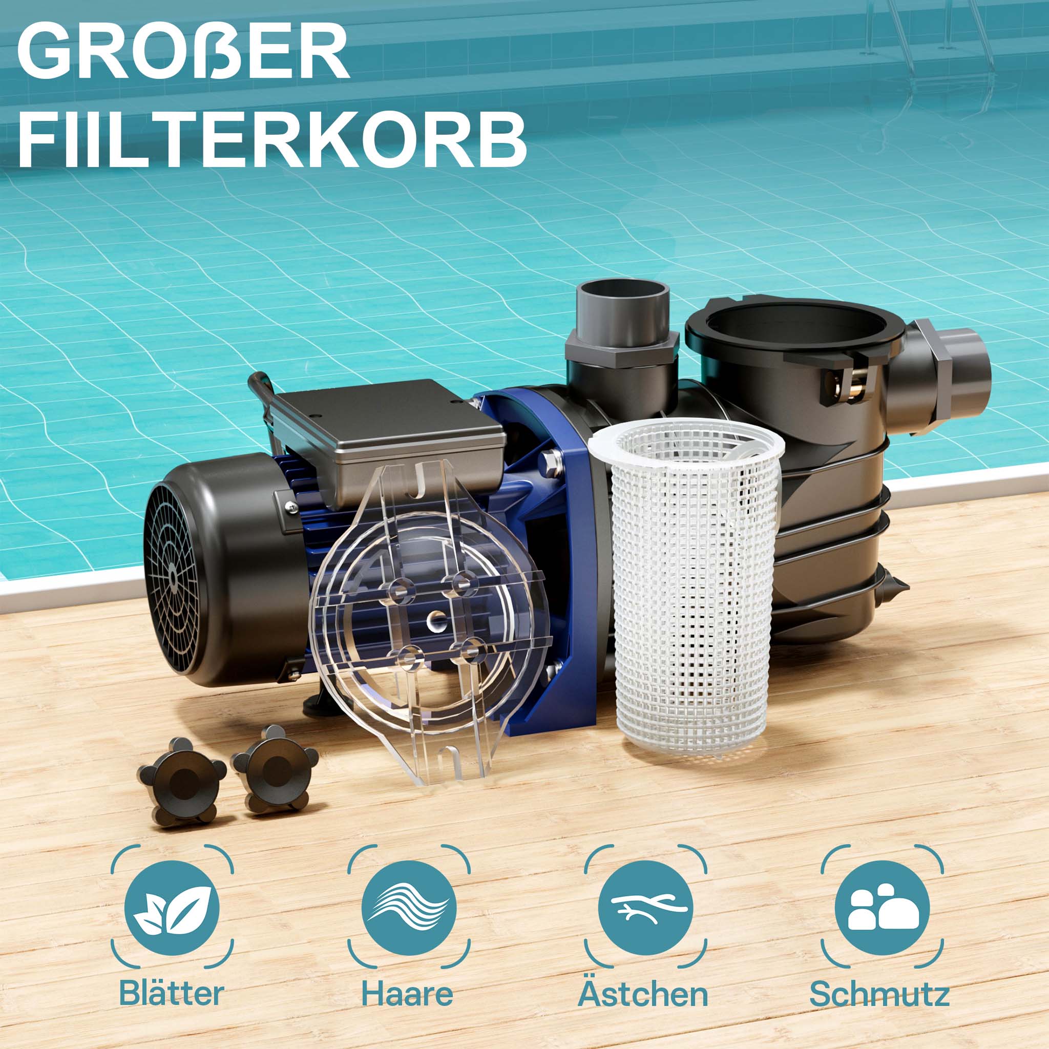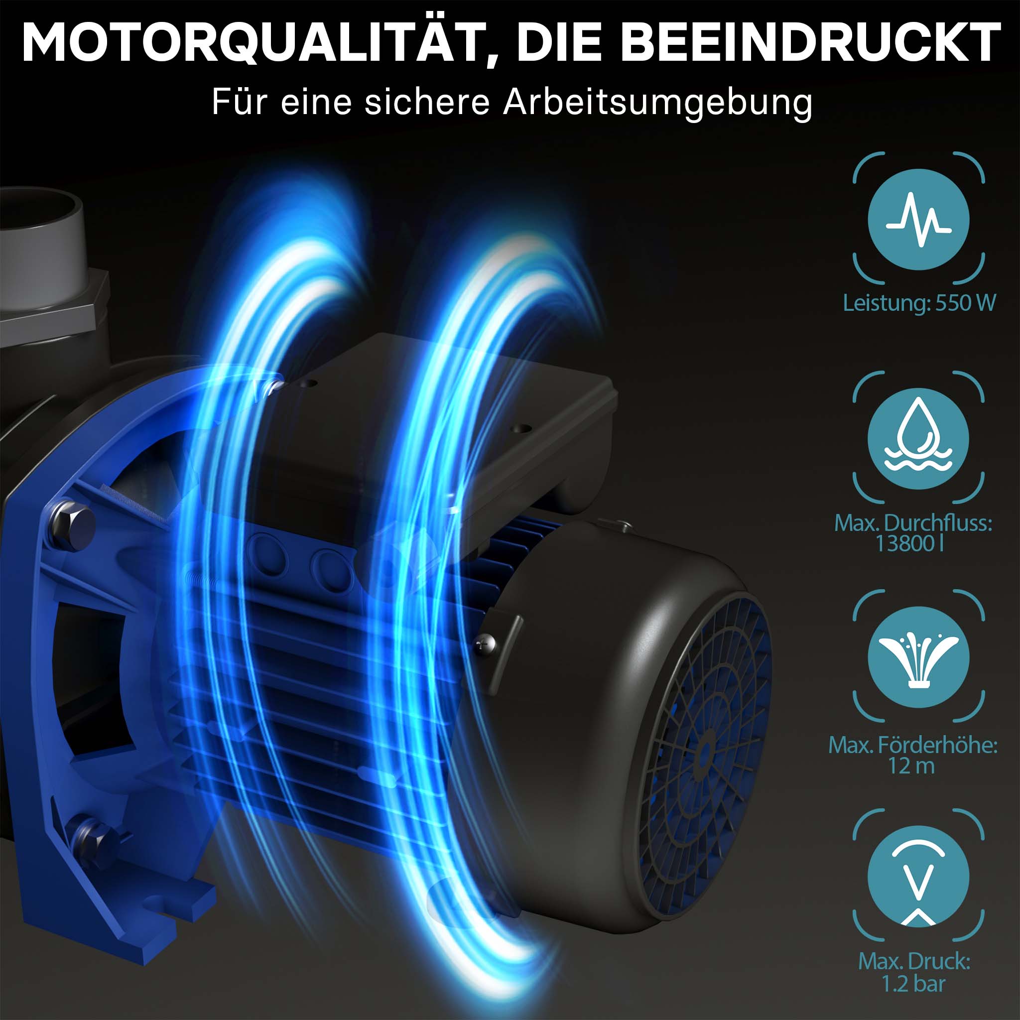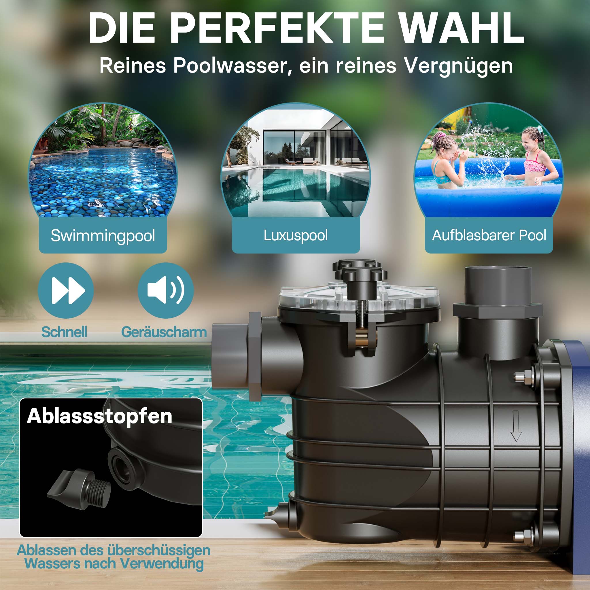 • Pompa per piscina silenziosa • Portata: 13800 l/h • Potenza assorbita: 550 W • Prevalenza max.: 12 m • Protezione antisovraccarico