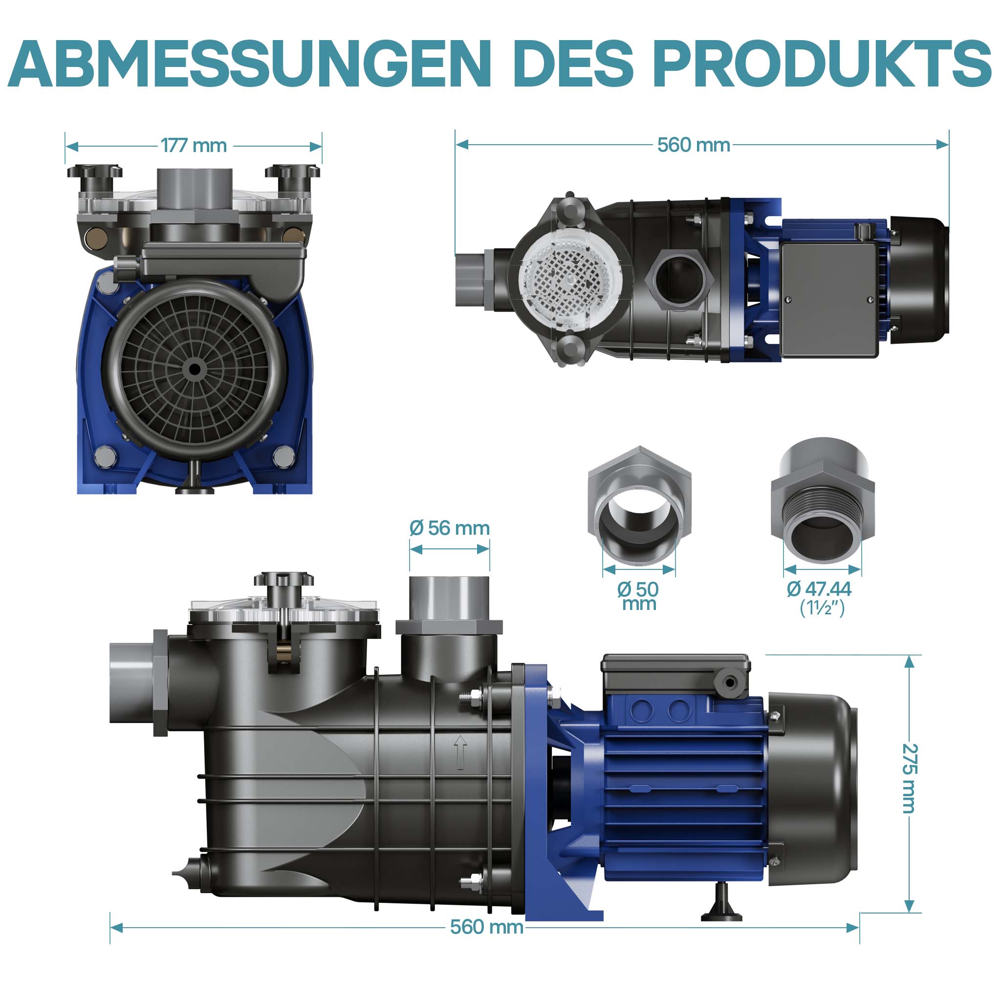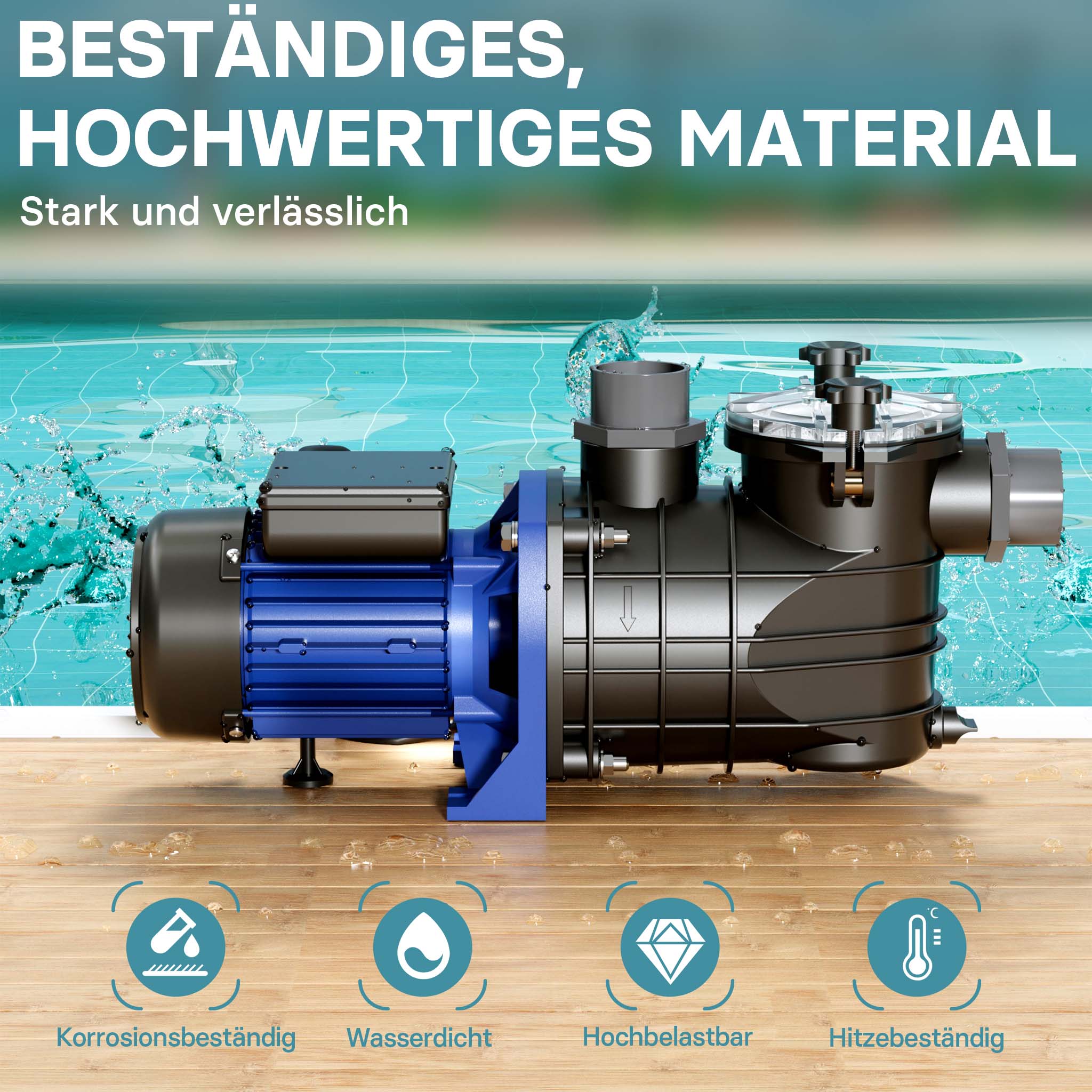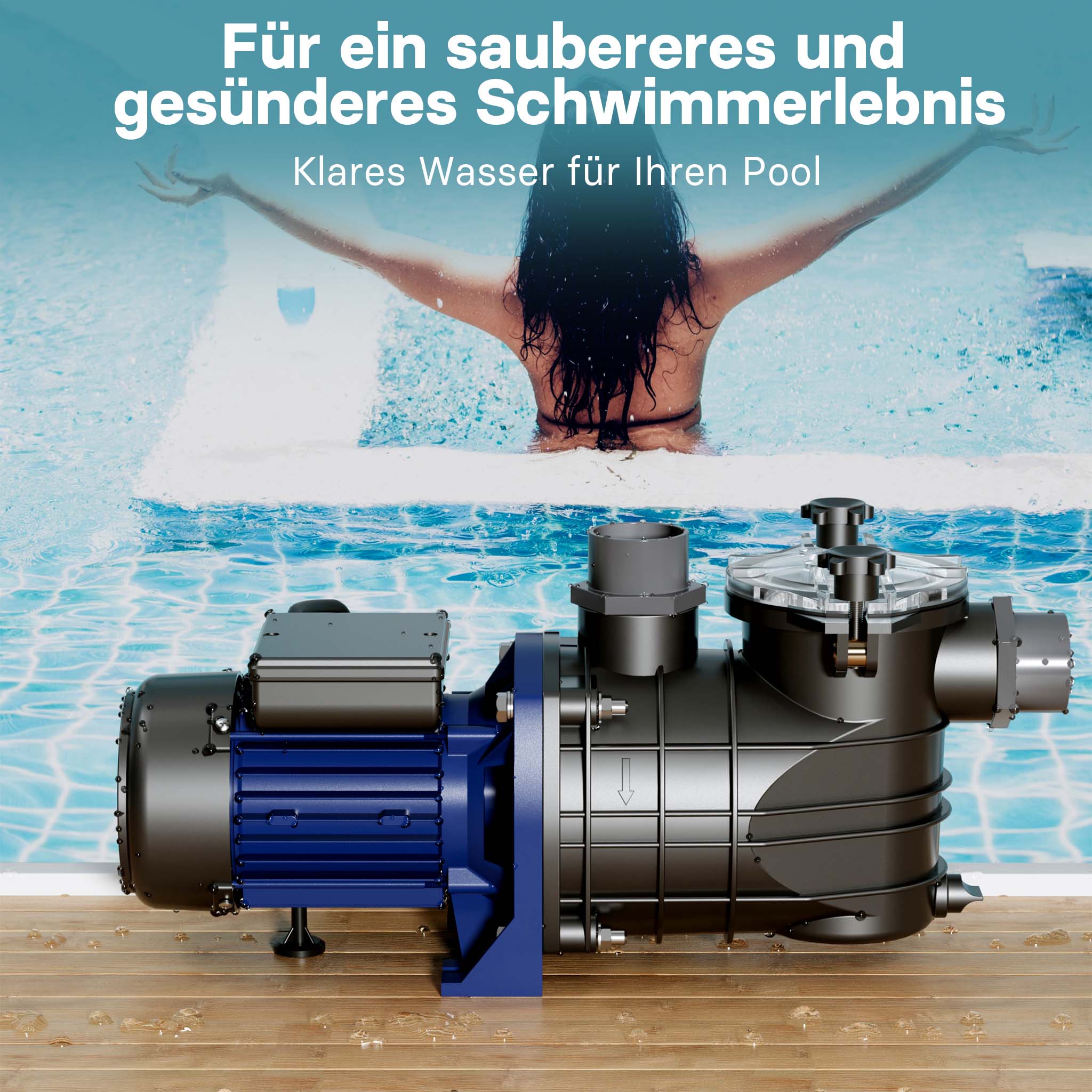 • Pompa per piscina silenziosa • Portata: 13800 l/h • Potenza assorbita: 550 W • Prevalenza max.: 12 m • Protezione antisovraccarico