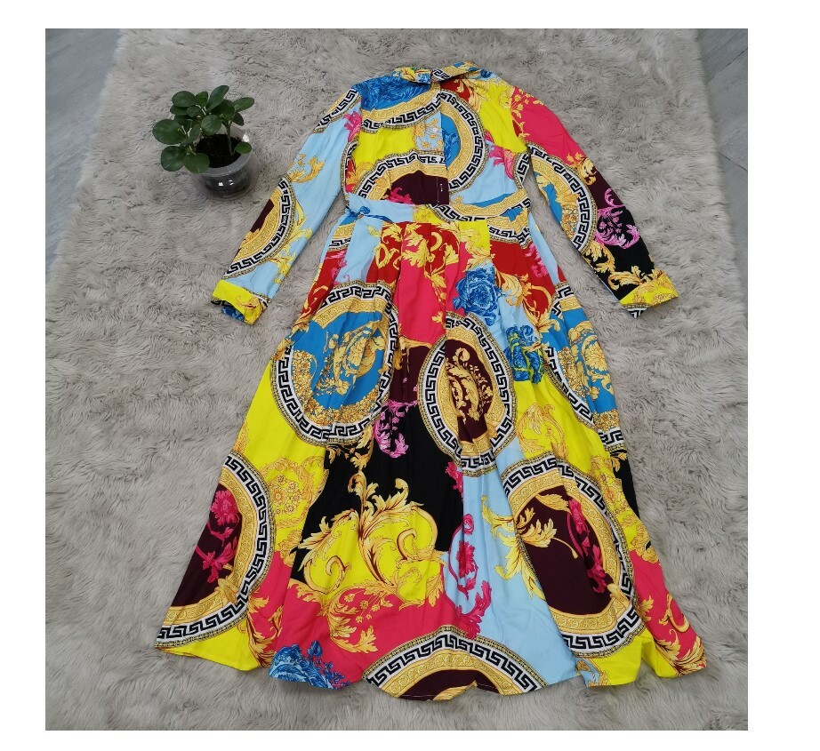 Women Long Sleeve Print Turn-down Party Vintage Bodycon Pleated Maxi Dress #P