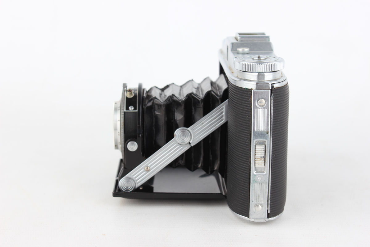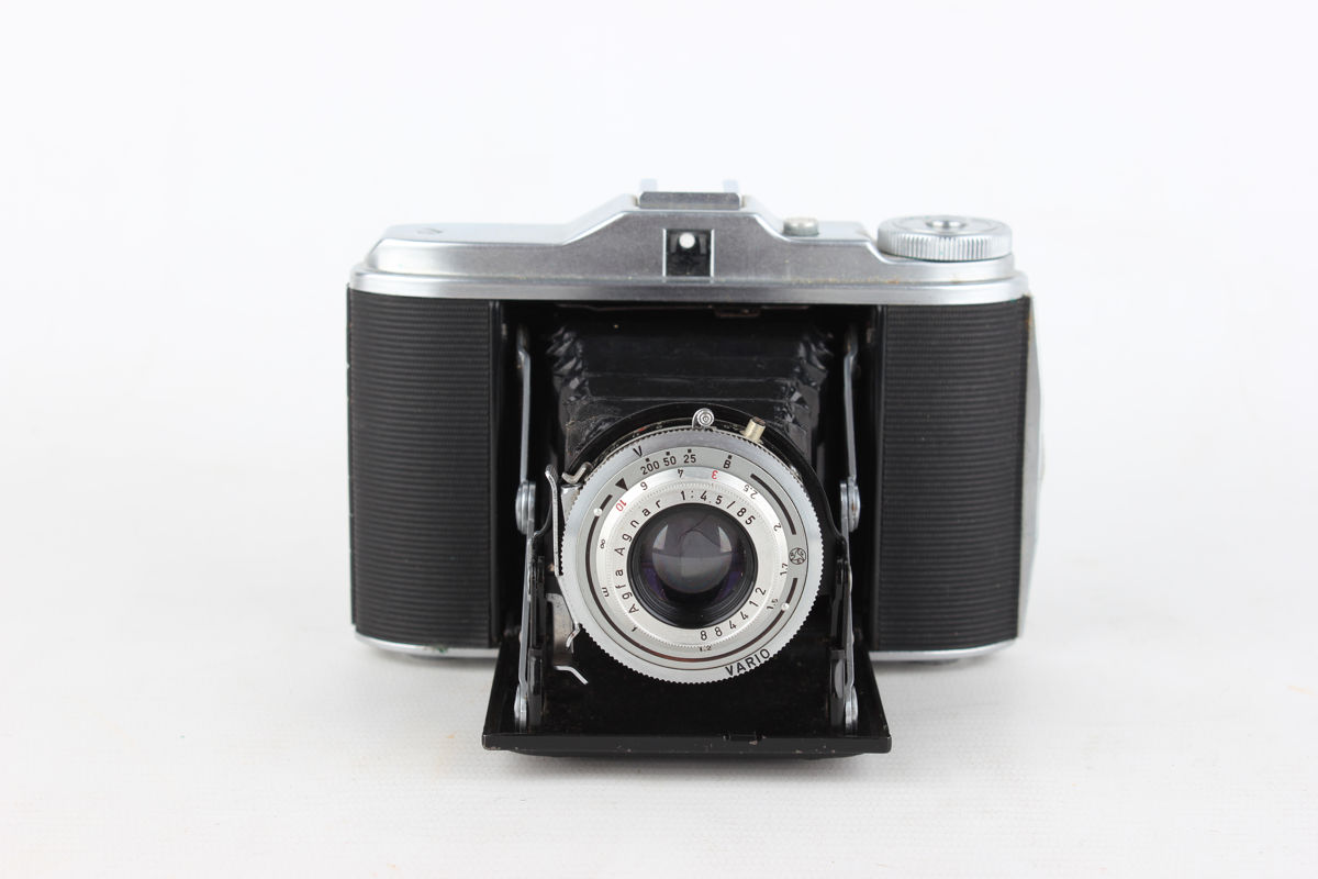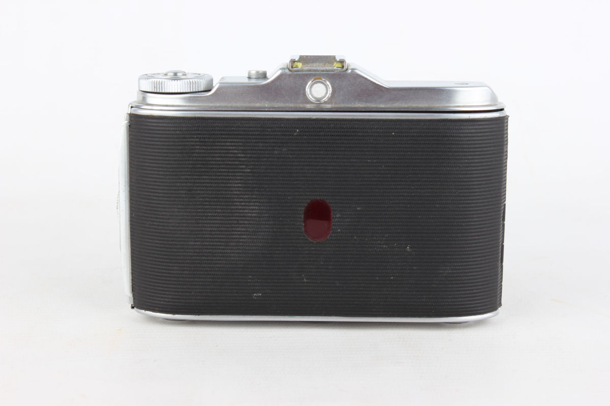 Rollfilmkamera mit Agfa Agnar 4,5 f=85mmAltersbedingte Gebrauchsspuren, der Verschluss löst aus, nicht auf Funktion geprüft.Gut erhaltenes Sammelobjekt. Komplett mit Ledertasche.