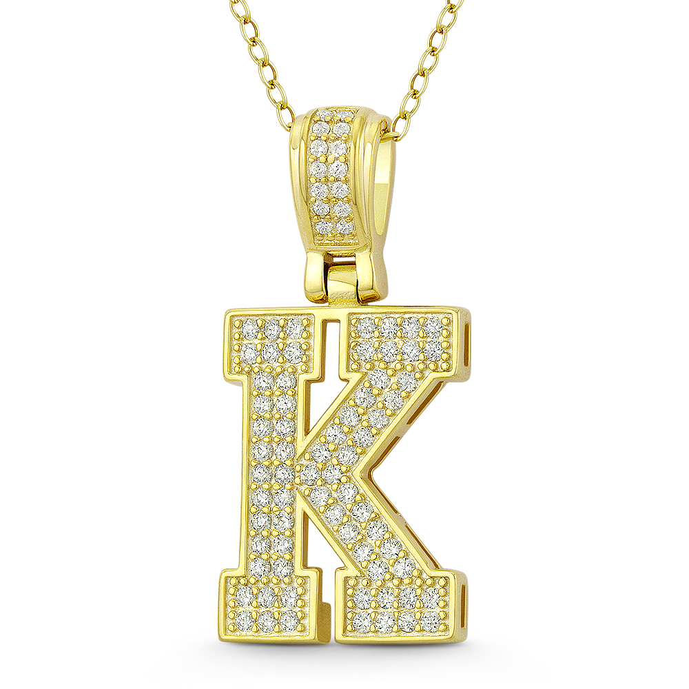 The featured pendant is cast in .925 sterling silver and showcases a block script initial "K" design paved w/ cubic zirconia crystals. The pendant is then finished with a sturdy bail that will accommodate most standard chains and plated with 14k yellow gold.