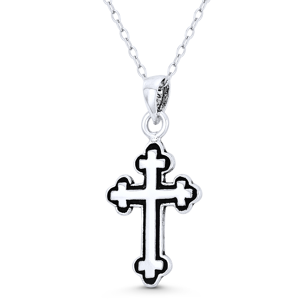 The featured pendant is cast in oxidized .925 sterling silver and showcases a budded cathedral cross finished with a sturdy bail that can accommodate most chain sizes.