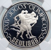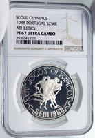 Portugal - Seoul, South Korea Olympics 1988 Proof Silver 250 Reis 37mm (28.00 grams) 0.925 Silver (0.8327 oz ASW) Reference: KM# 643a Certification: NGC PF 67 ULTRA CAMEO 2839341-003 REPUBLICA PORTUGUESA 250 ESC., Shield with rings above and behind. XXIV JOGOS OLIMPICAOS SEUL 1988 H.BATISTA, Greek runners right. You are bidding on the exact item pictured, provided with a Certificate of Authenticity and Lifetime Guarantee of Authenticity.