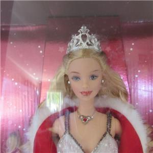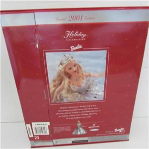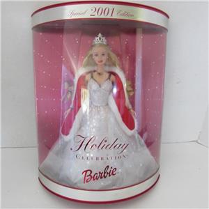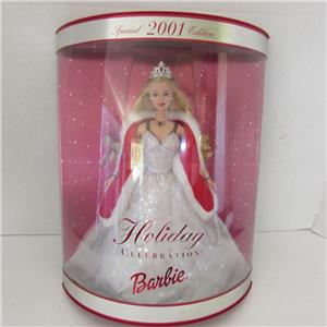 Up for your consideration is this 2001 HOLIDAY CELEBRATION BARBIE, SPECIAL EDITION, Mattel #50304. Her shimmering white gown is covered with silver stars, she has a silver tiara, and a red shoulder wrap with white fur trim. She stands 11 1/2" tall, is for kids ages 6 and up. Shoes and doll stand are also included. She is an Estate found doll and has never been removed from the box. This would be a terrific Christmas gift and a great addition to any collection. The front of the box has some marks but has not been compromised.