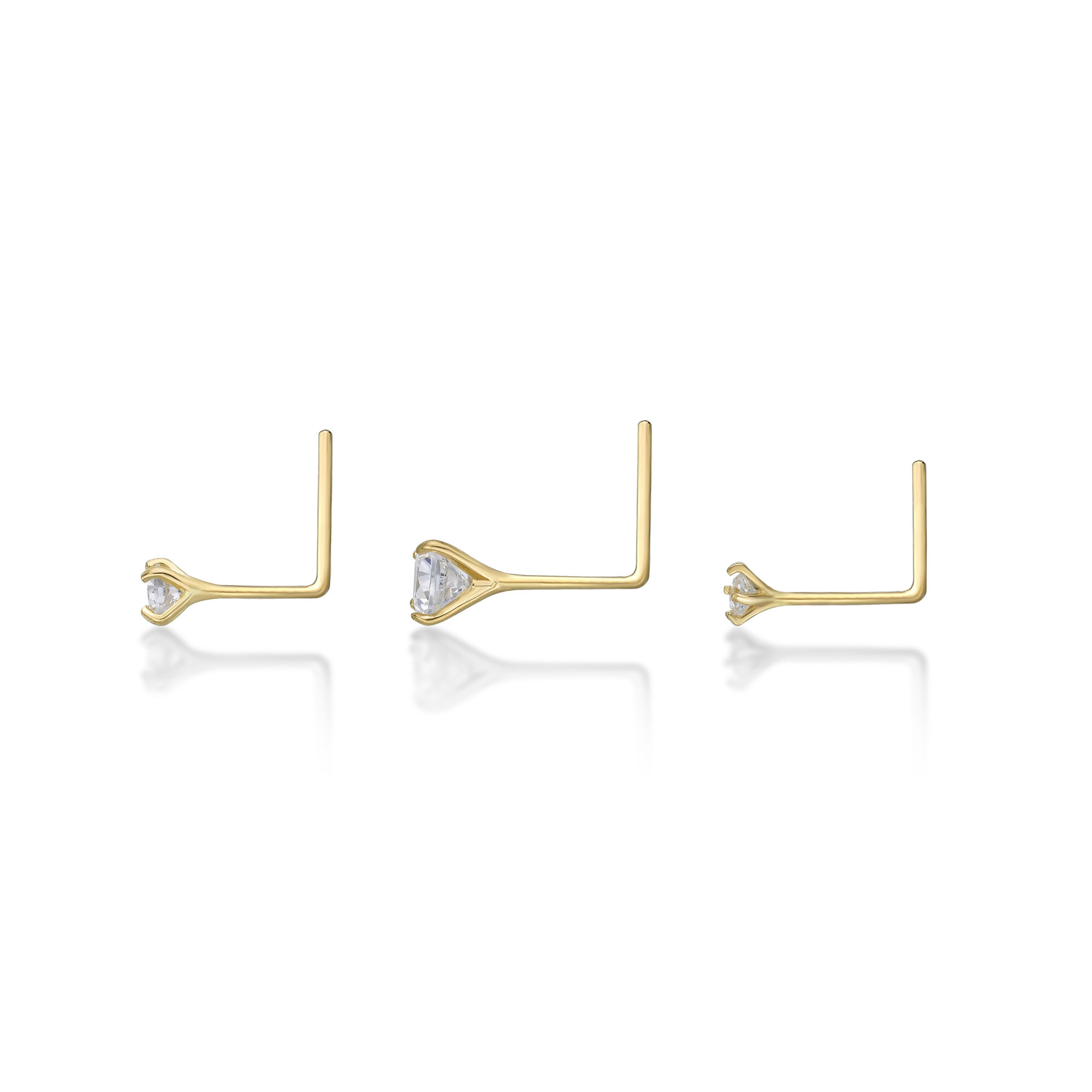 Elevate your style and showcase your personality with our 22 Gauge 3 Piece L-Shaped 14K Yellow Gold Cubic Zirconia Nose Ring Set. Don't miss out on the opportunity to own this exquisite set. Order yours today and take your nose piercing to the next level!