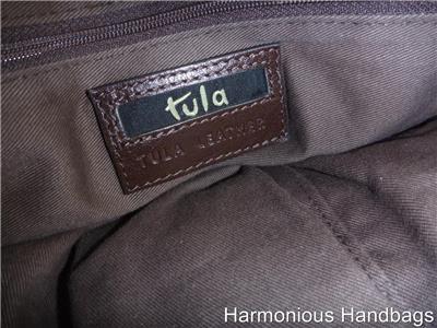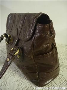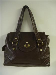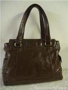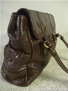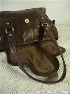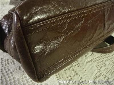 It has a dark brown leather body and straps that has a stylistically distressed look in a glossy finish.