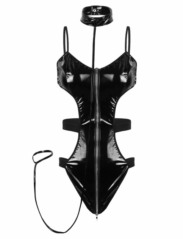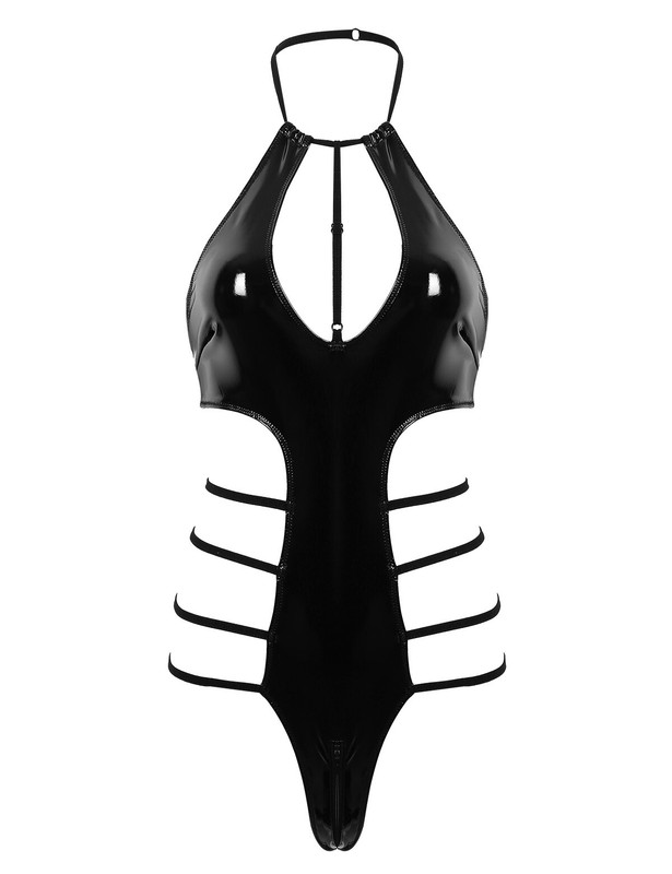 Women’s hot one-piece patent leather buckle thong leotard bodysuit nightwear, wet look appearance.