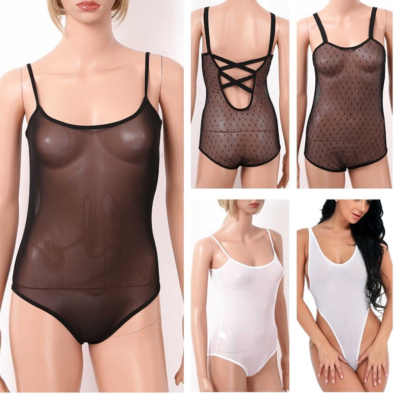 Halter neck and backless, hollow out fishnet cups and zippered crotch, back with clasp closure for a secure fit.