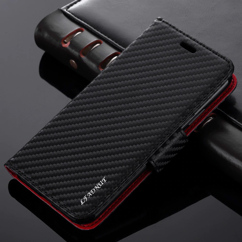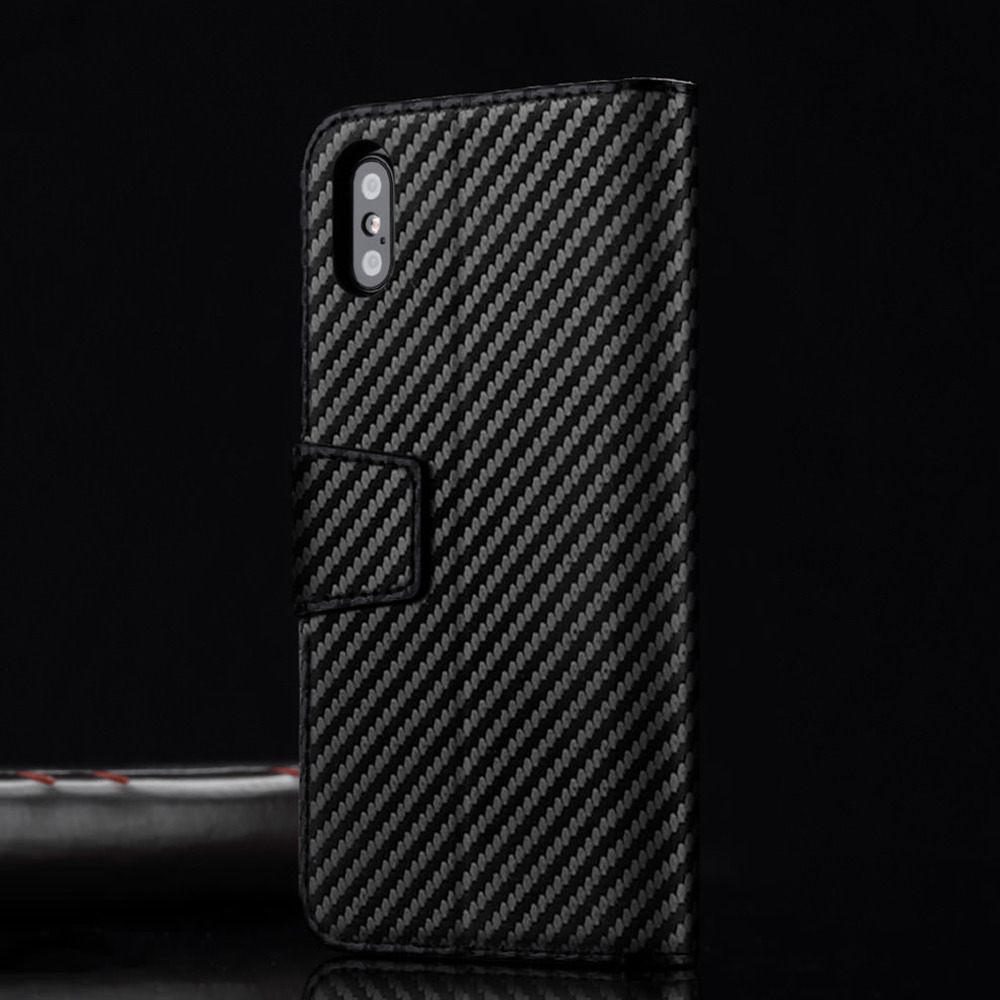 It is an embossed Carbon fibre texture outside. Embossed red leather skin-type texture inside. totally of 3 card slots and 1 cash or bill site.