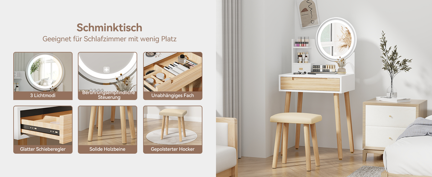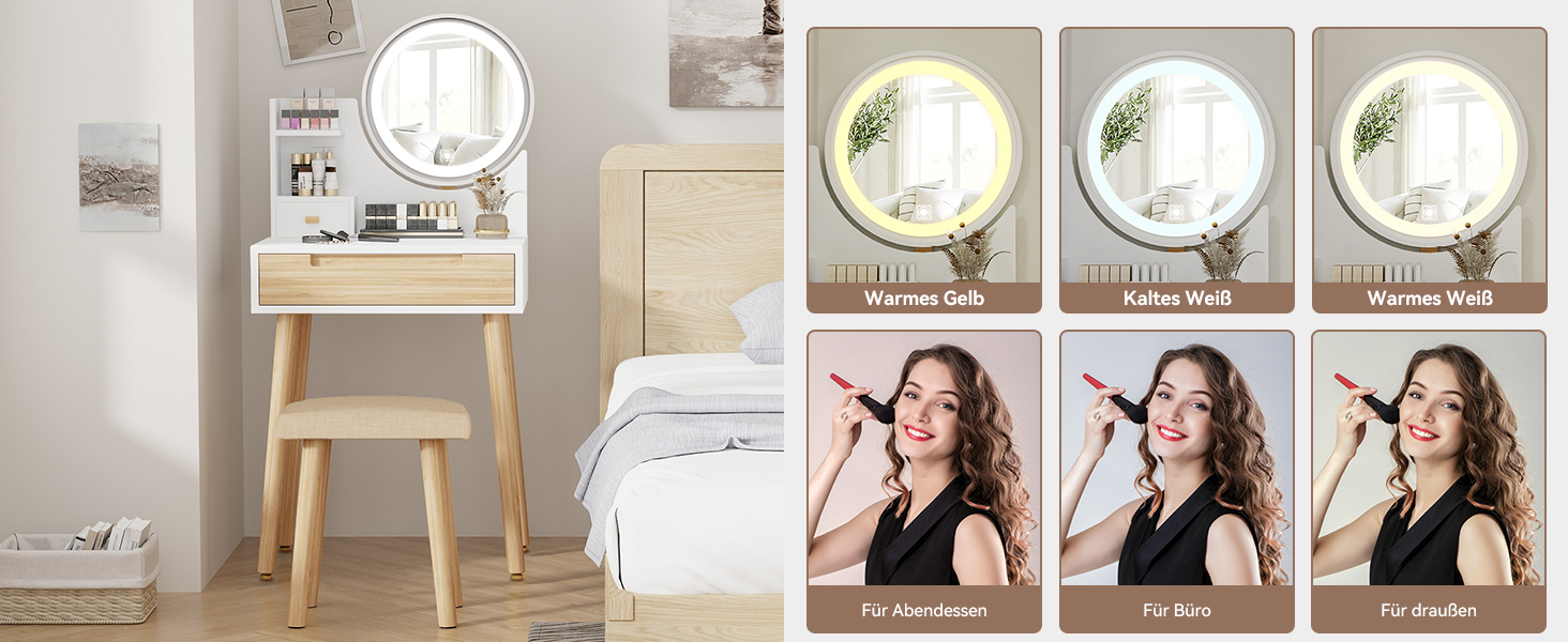 - Großzügige Schubladen: Einfaches Ordnen und Aufbewahren von Kosmetika, Schmuck und anderen Gegenständen.