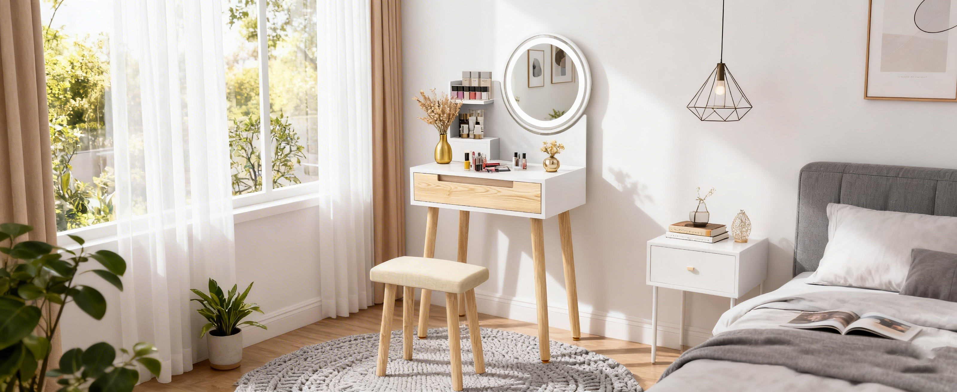 - Inklusive Frisierhocker: Weicher, atmungsaktiver Leinenstoff für bequemes Sitzen.