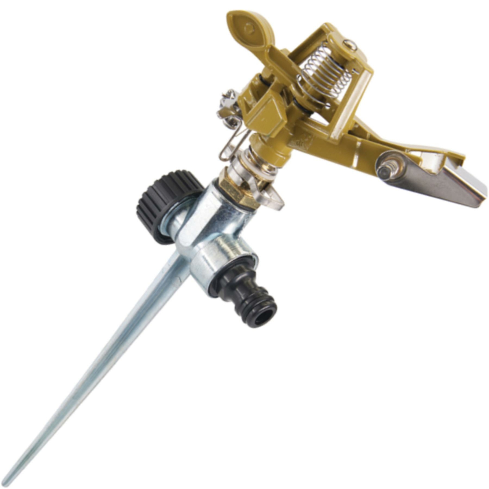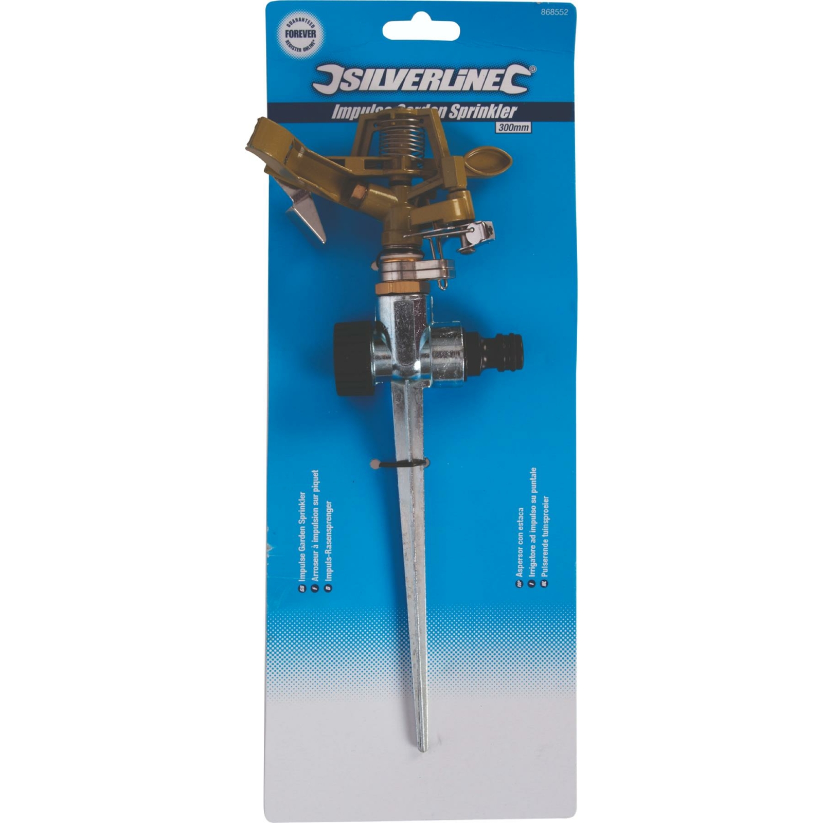 Silverline Spiked Impulse Sprinkler Spiked, pulsating garden sprinkler made from metal with precision brass nozzle. 360? or adjustable spray pattern. Universal ?? male hose connector and daisy chain facility.