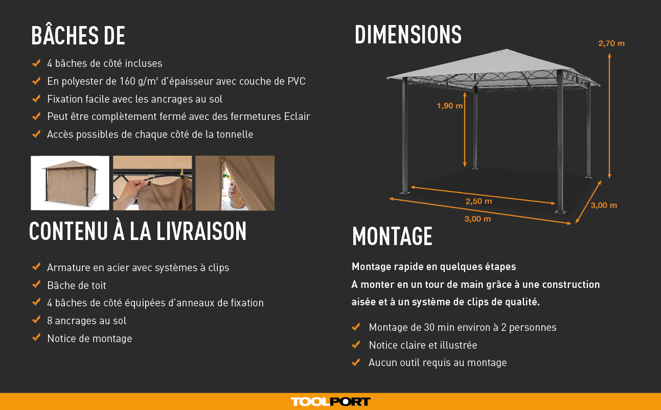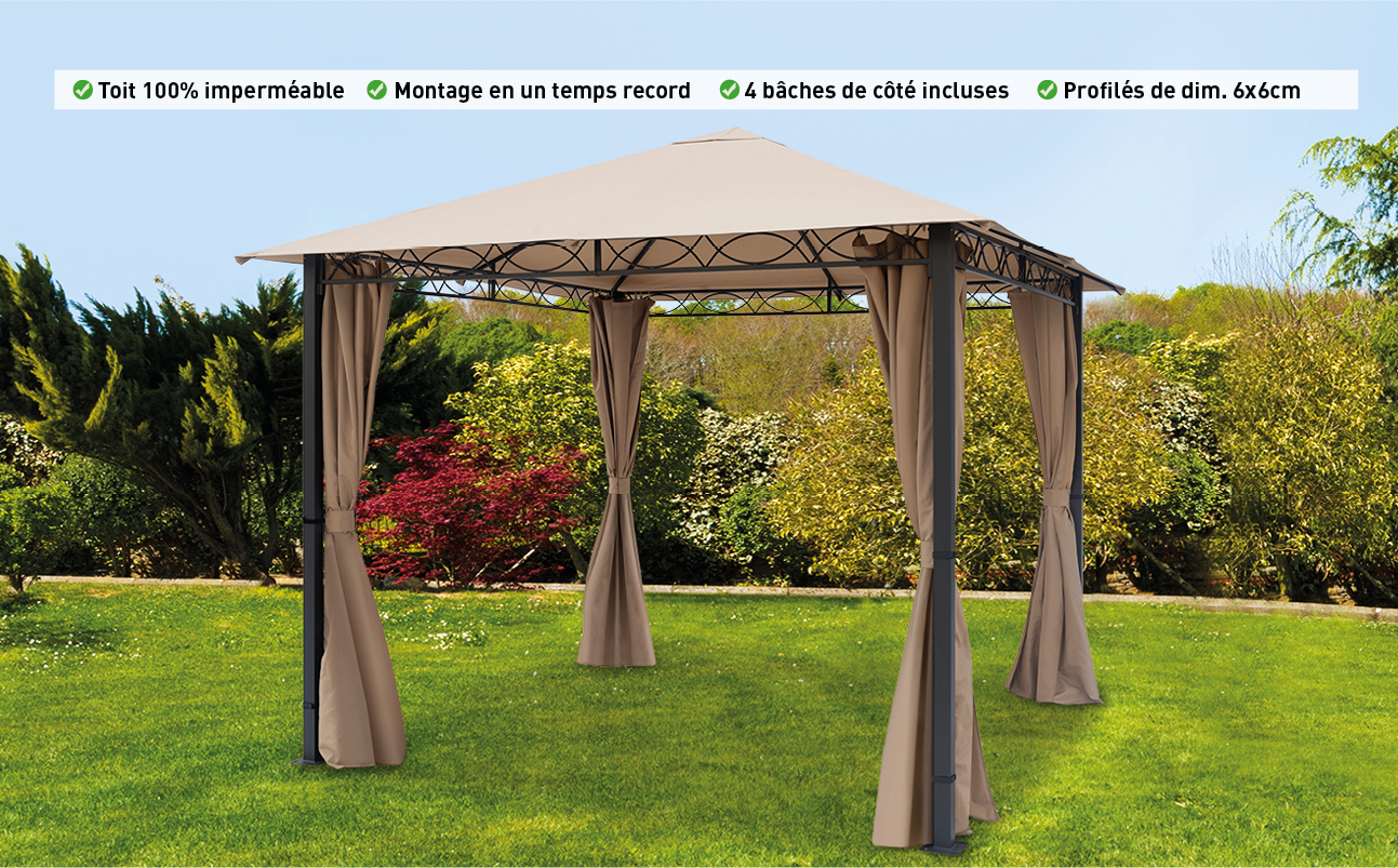 Dotée d’une structure en acier traité anti-corrosion (par pulvérisation de poudre) et d’éléments décoratifs, la tonnelle Paradise Premium permet un montage rapide et facile grâce à son mécanisme performant de fixation par clips.