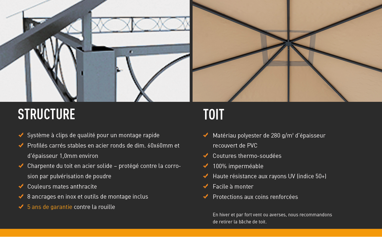 Constituée d’un toit en polyester (180 g/m²) 100% imperméable et d’une structure en acier traité contre la corrosion par pulvérisation de poudre, elle représente un abri sûr.