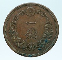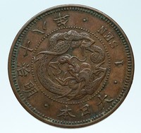 Japan under Meiji - Emperor of Japan: 3 February 1867 - 30 July 1912 1885 Copper Sen 27mm (7.20 grams) Reference: Y# 17 年十治明 · 本日大 · 1 SEN ·, Dragon within beaded circle, legends above. 圓一換 枚百以 一 錢, Chrysanthemum Flower (Coat of Arms & Emperor's Royal Seal) Branches of Paulownia Flower (Heart shaped leaf) and Chrysanthemum Flower. You are bidding on the exact item pictured, provided with a Certificate of Authenticity and Lifetime Guarantee of Authenticity.