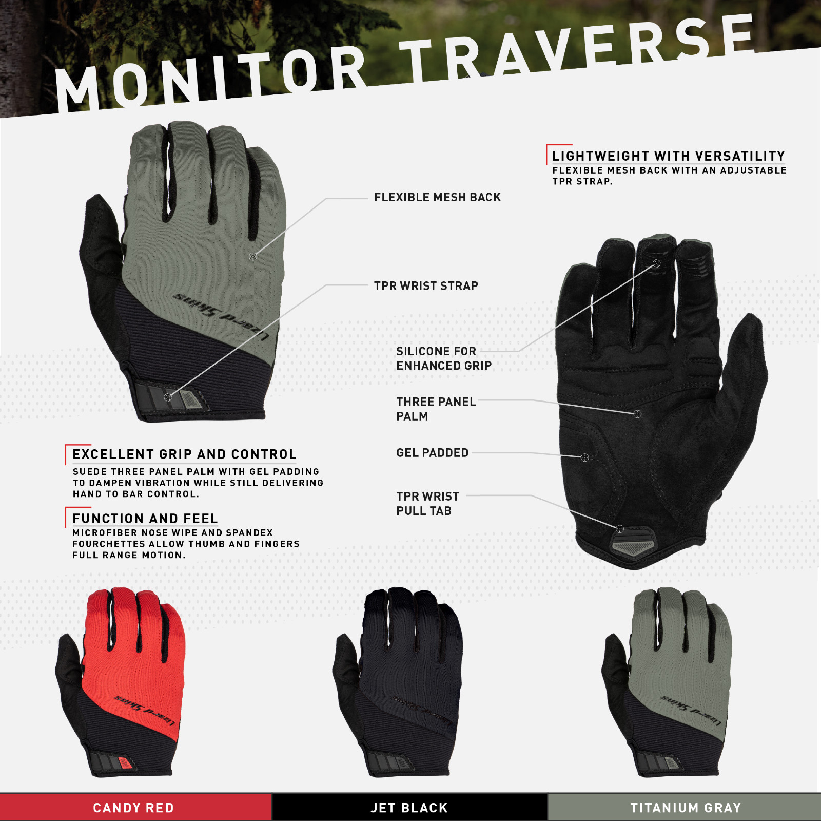 - KEY FEATURES – The Lizard Skins Monitor Traverse Cycling Gloves have more features and functions than you will find on any competitor gloves, including: Flexible Mesh Back, Adjustable TPR Strap, Anti-Slip Silicon On Index And Middle Finger, Suede Padded Palm, Gel Padded Palm and A Microfiber Nose Wipe. What are you waiting for? Pick up a pair today!