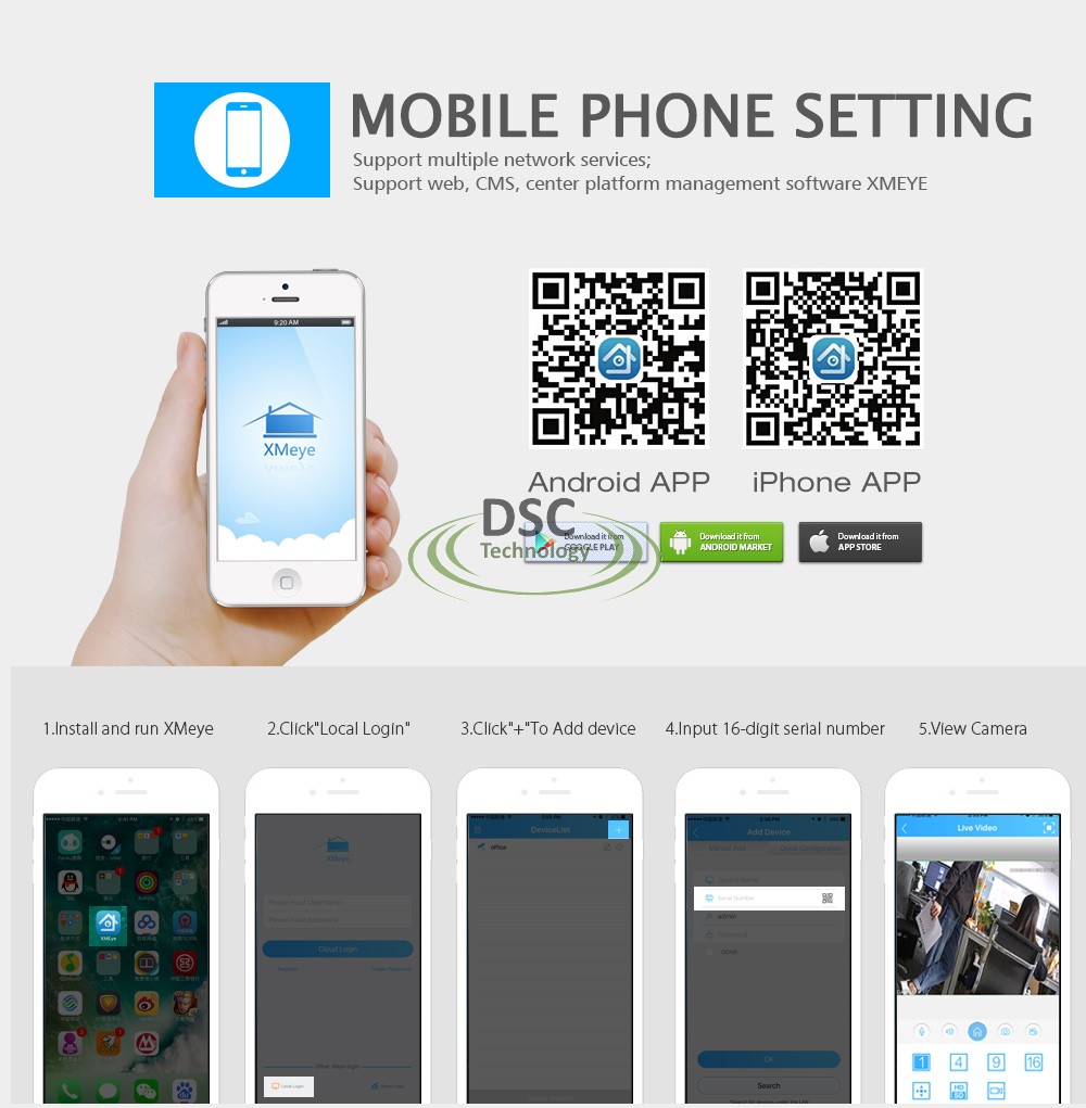 - Supports mobile video surveillance (iCsee /XMEYE for iOS, Android)