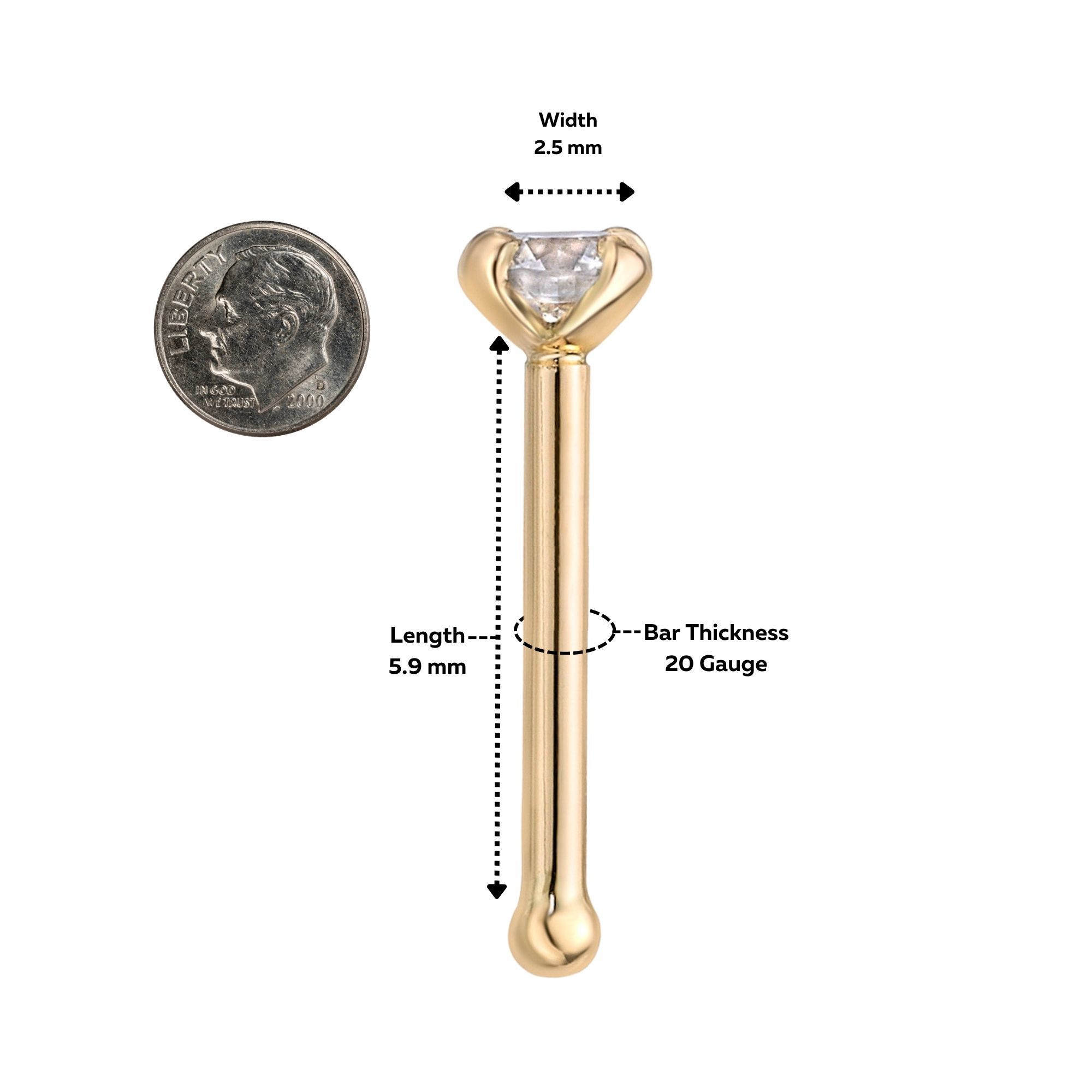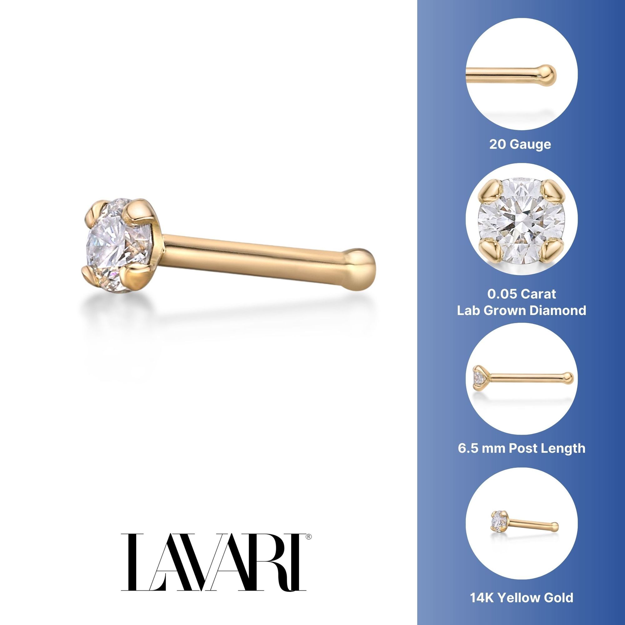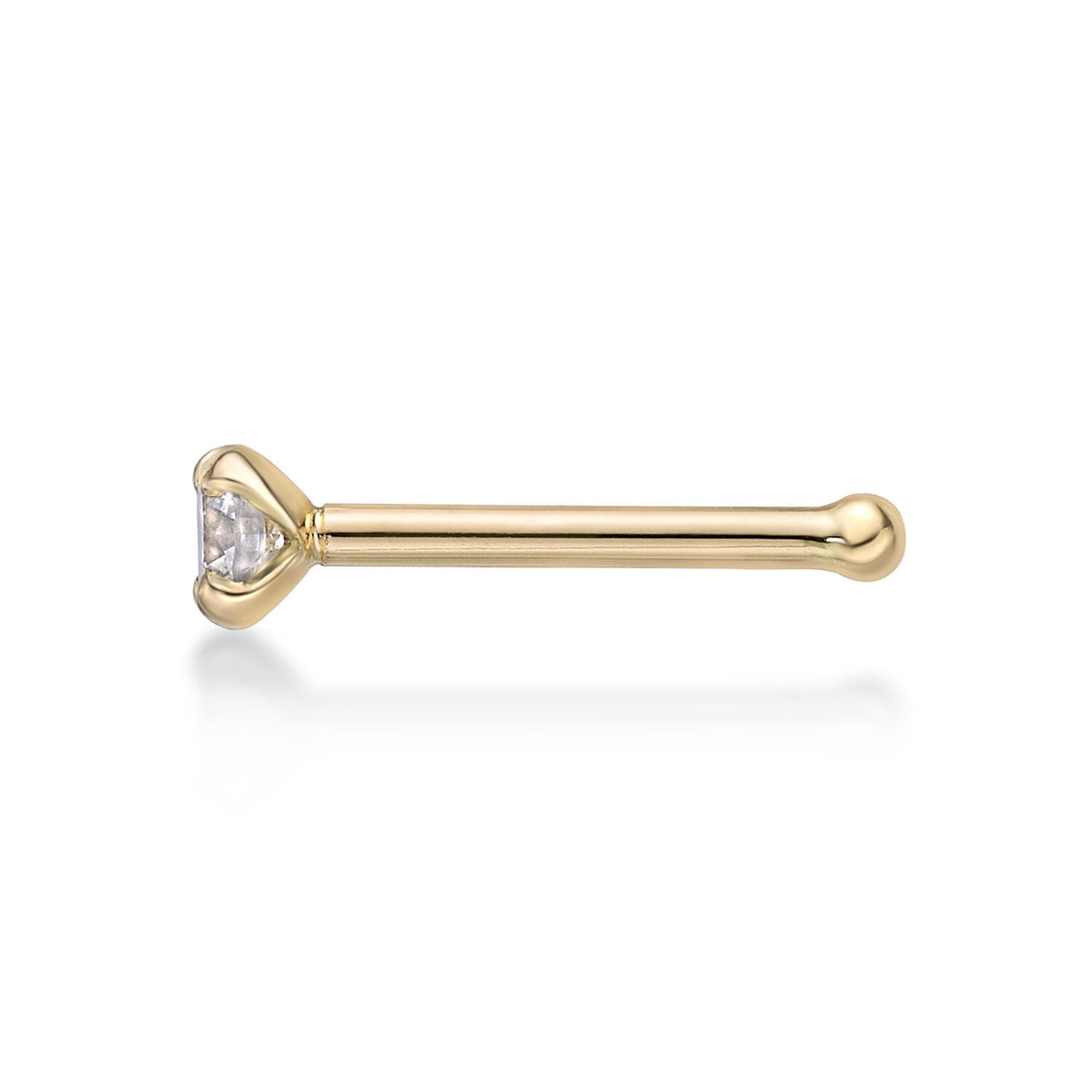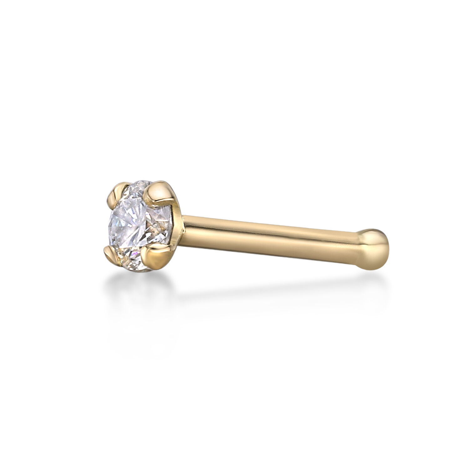 This nose ring features a stunning Lab Grown Diamond stone and it is crafted in a 20 g (0.8 mm) size and comes with a Straight post made from Yellow Gold. For care, simply To keep your lab grown diamond and yellow gold jewelry looking its best, avoid exposure to harsh chemicals, perfumes, and cosmetics. Store in a dry, cool place and clean with a soft cloth. For more thorough cleaning, use a gentle jewelry cleaner and avoid excessive rubbing or scratching..